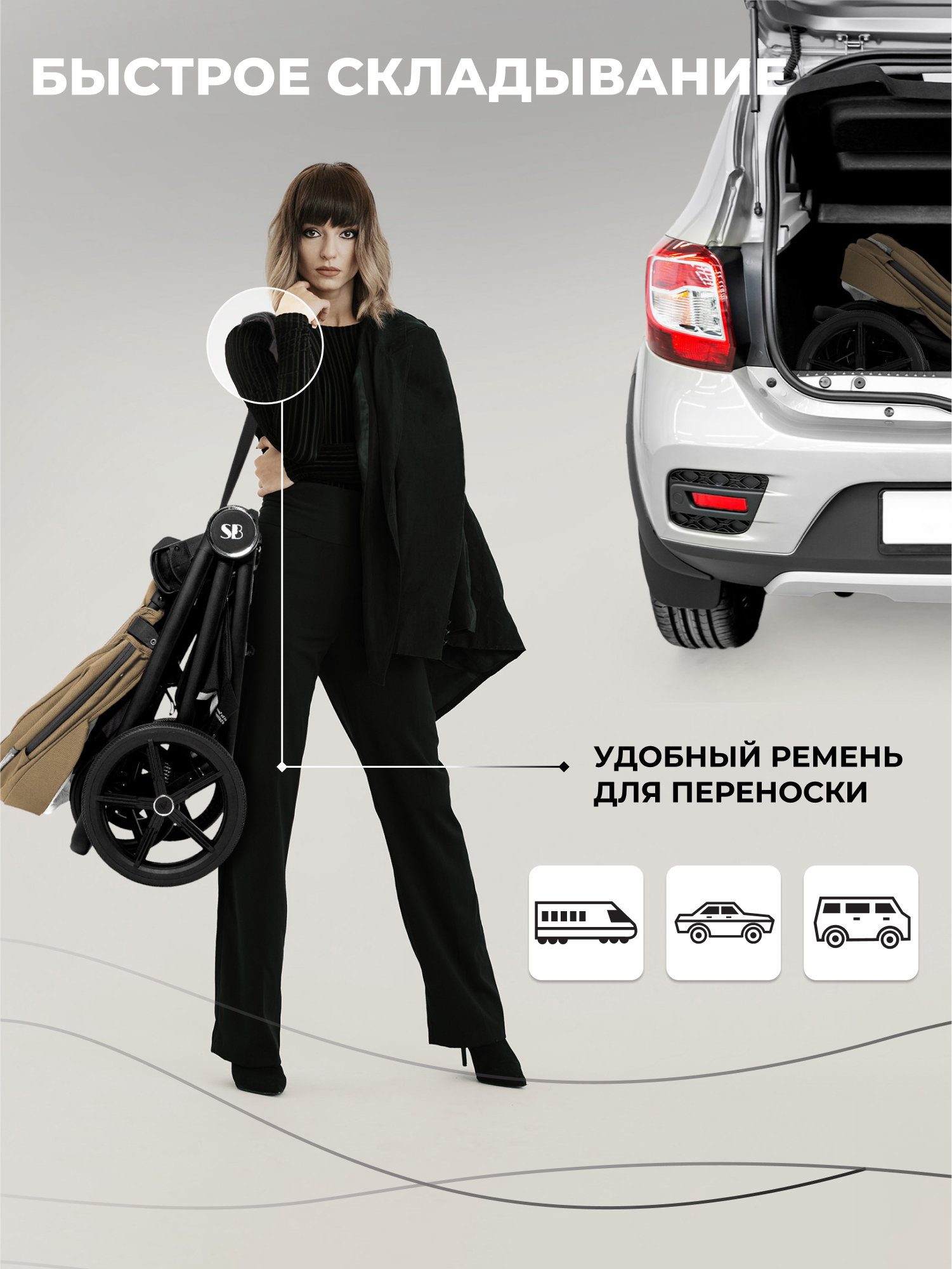 - вес шасси всего 6,6 кг! Легко складывается одной рукой и в сложенном виде не занимает много места. А для удобной переноски шасси оснащено специальным ремнем с плечевой накладкой