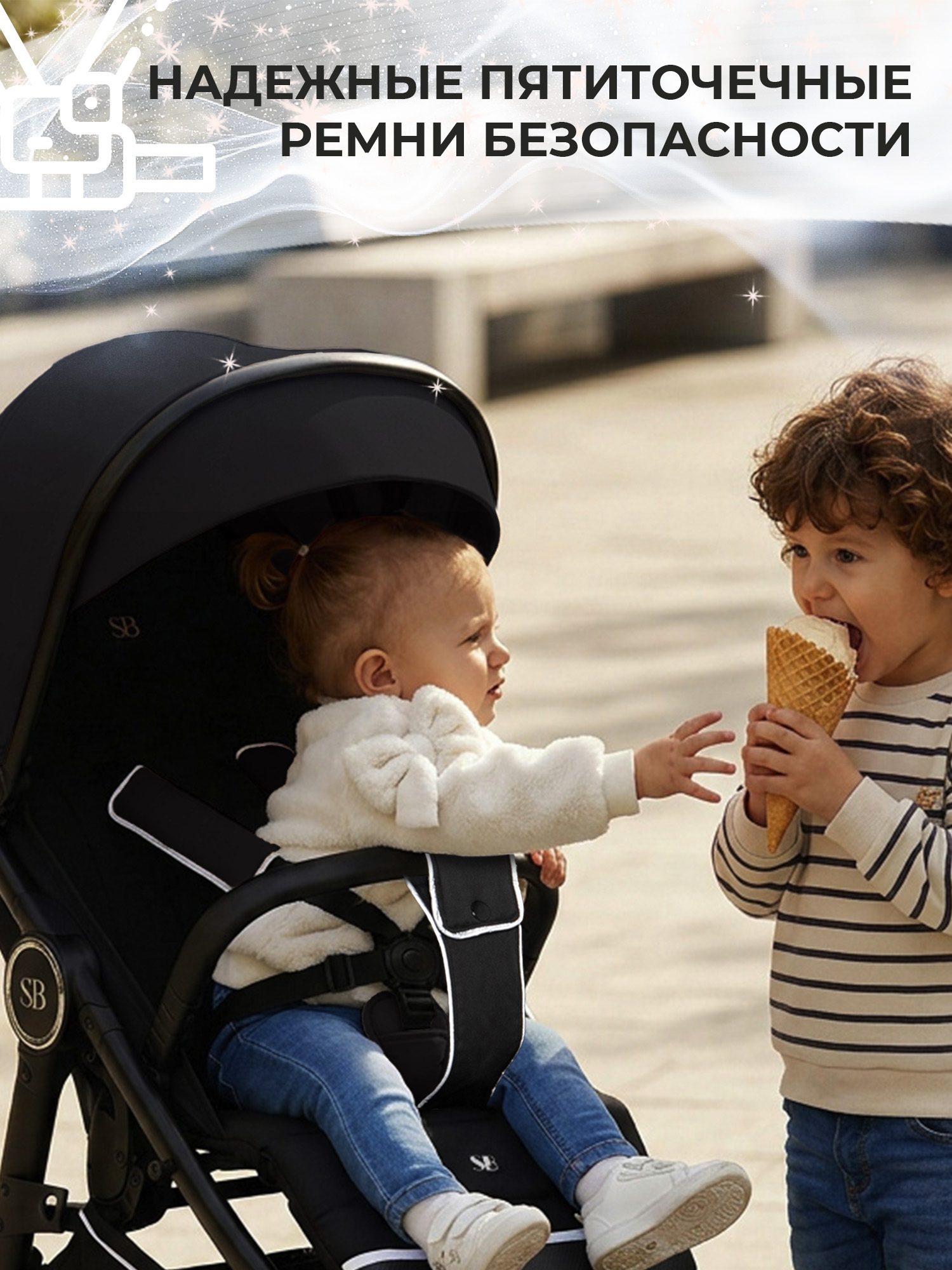 Для безопасности малыша предусмотрены пятиточечные ремни с мягкими накладками и светоотражатели на ремнях, бампере и корзине, что улучшает ее видимость в темное время суток. Увеличенный регулируемый капюшон с двумя замками из непромокаемой и продуваемой ткани защитит маленького пассажира от непогоды.