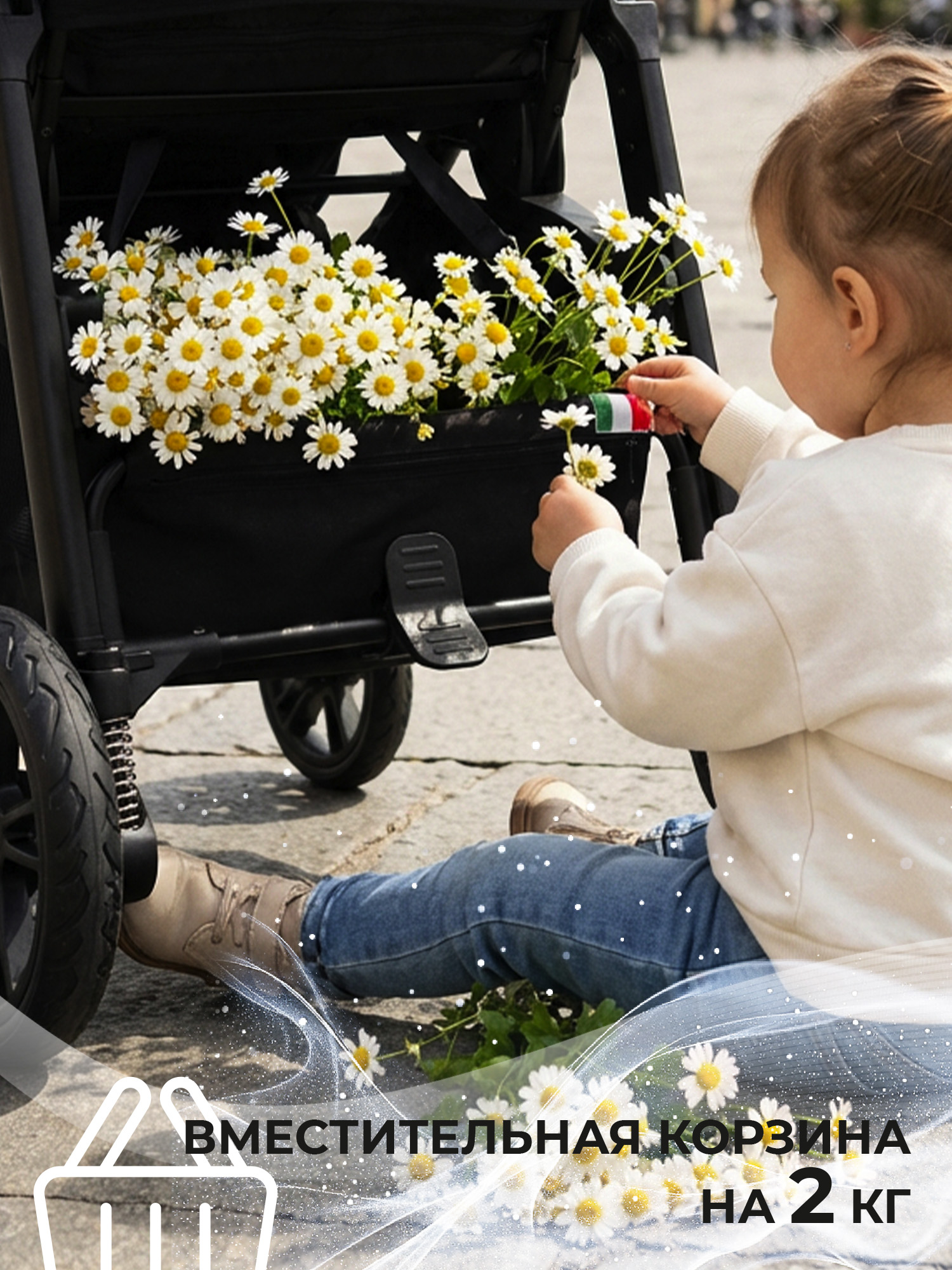 Для безопасности малыша предусмотрены пятиточечные ремни с мягкими накладками и светоотражатели на ремнях, бампере и корзине, что улучшает ее видимость в темное время суток. Увеличенный регулируемый капюшон с двумя замками из непромокаемой и продуваемой ткани защитит маленького пассажира от непогоды.