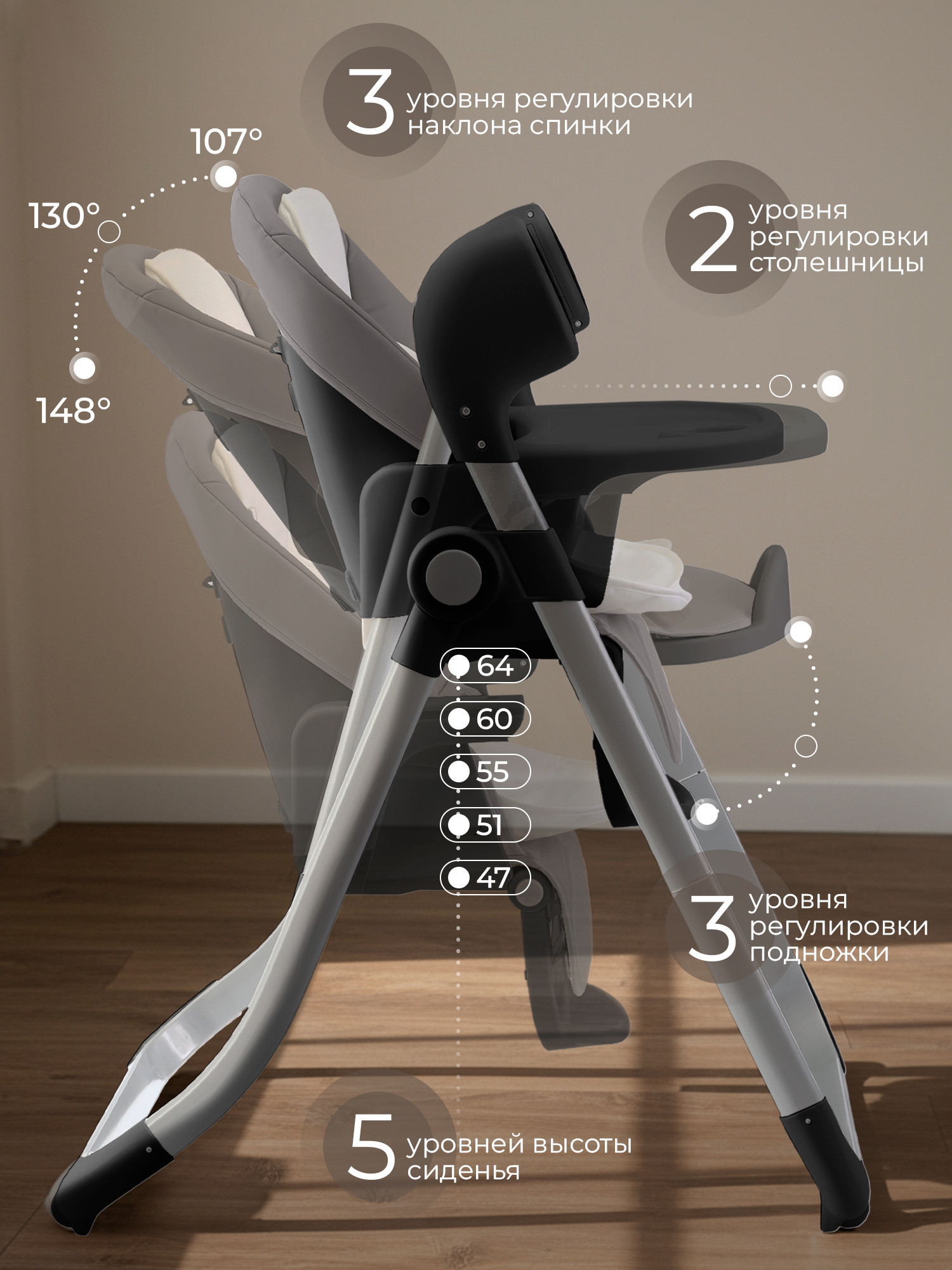 - 6 уровней высоты сиденья;