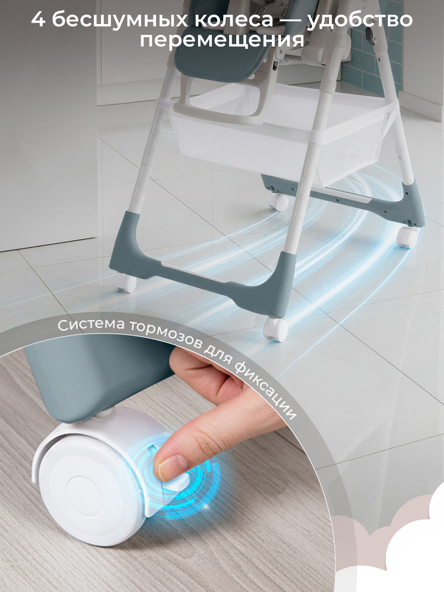 Поворотные колёса с силиконовыми накладками, имеют функцию блокировки.