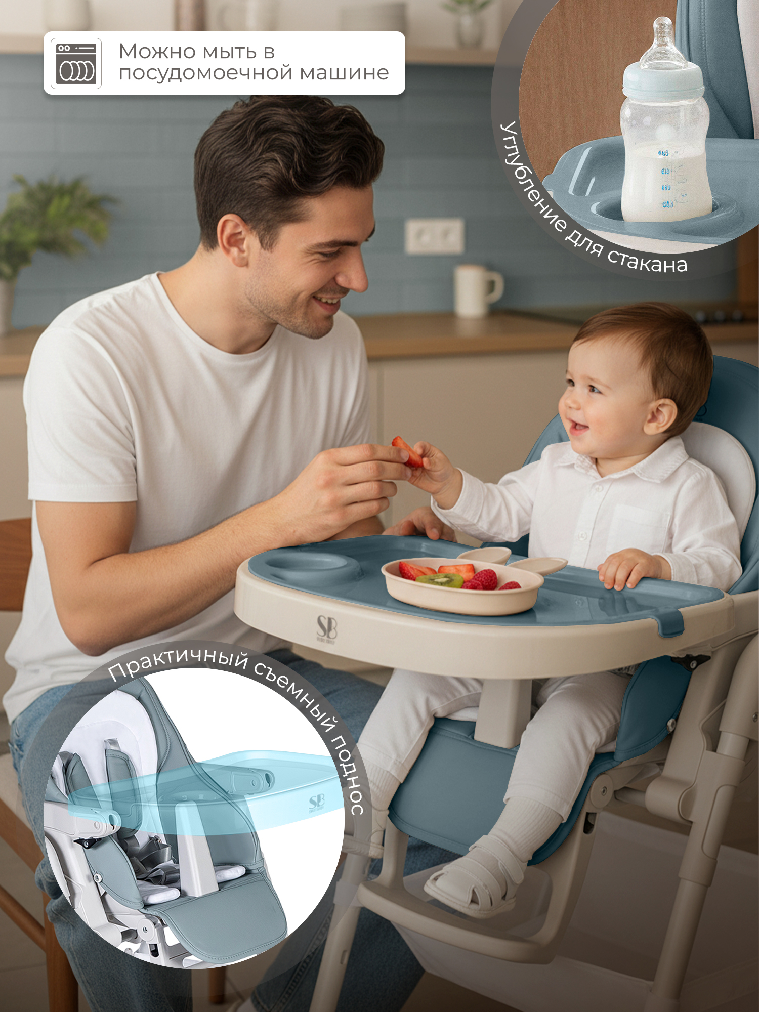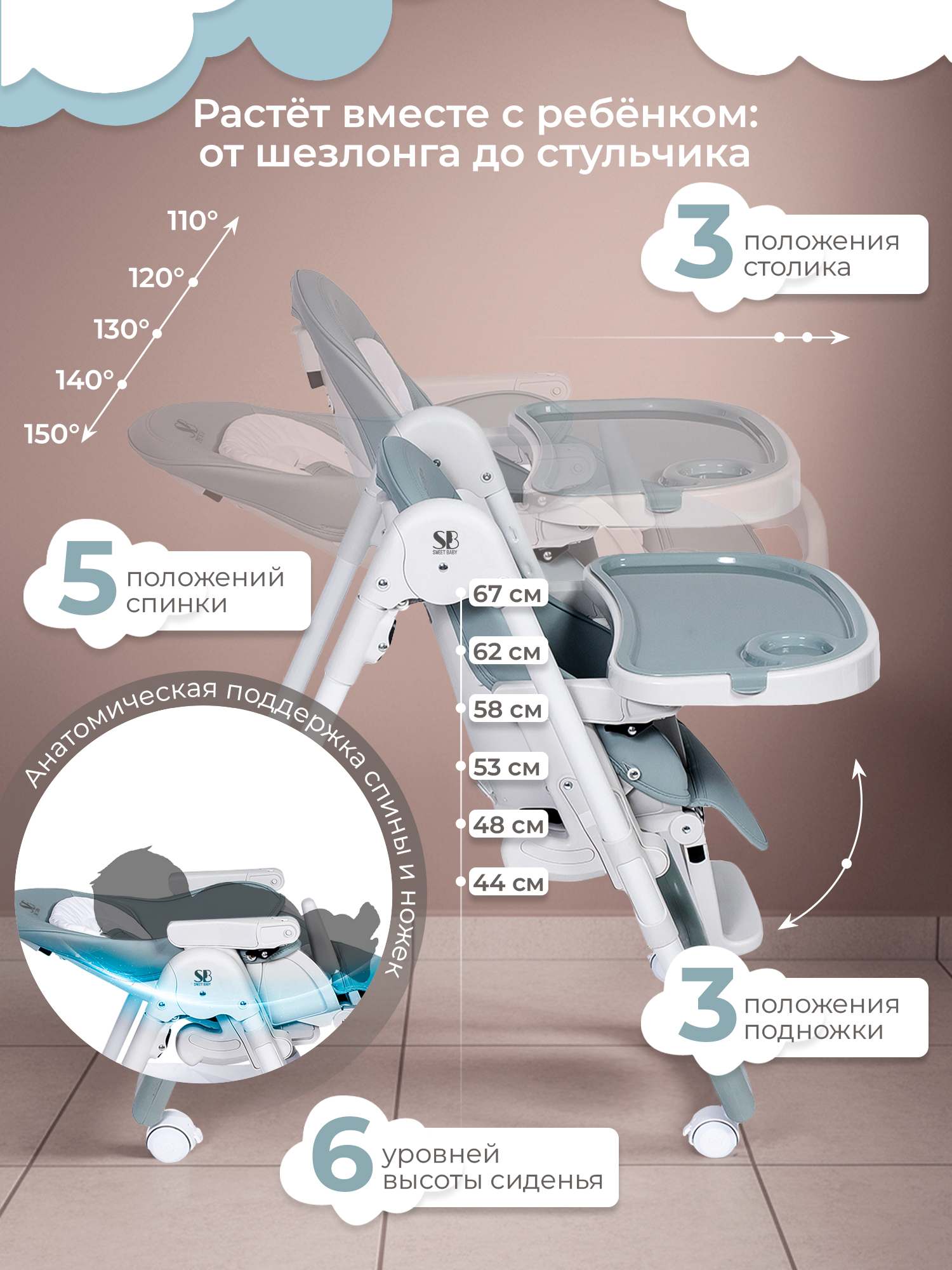 Поднос несложно установить в одном из 3 положений, выбрав наиболее удобное для малыша.