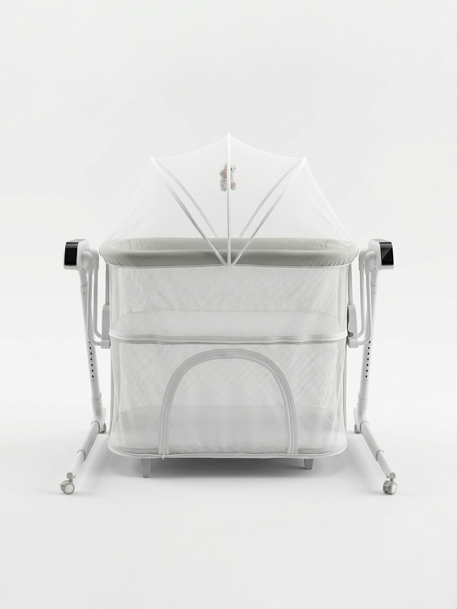 - 8 положений регулировки высоты позволяют настроить колыбель под родителей любого роста, а также превратить ее в приставную кроватку, подобрав идеальное расположение рядом с родительской кроватью.