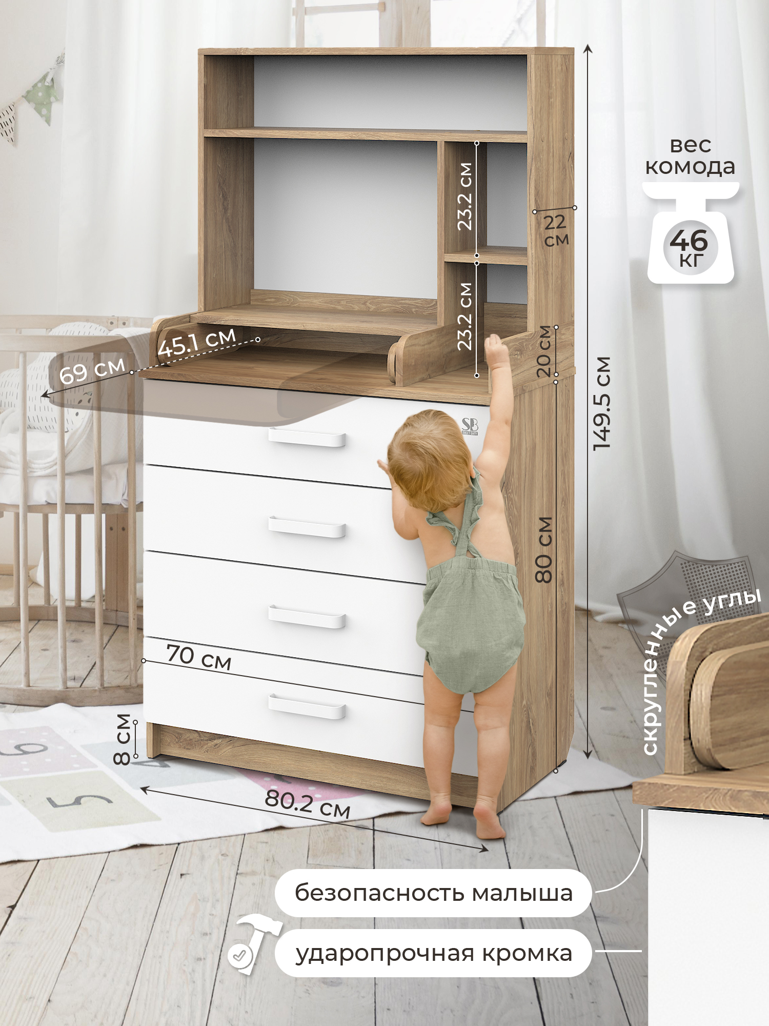 - Высота до пеленального стола 80 см
