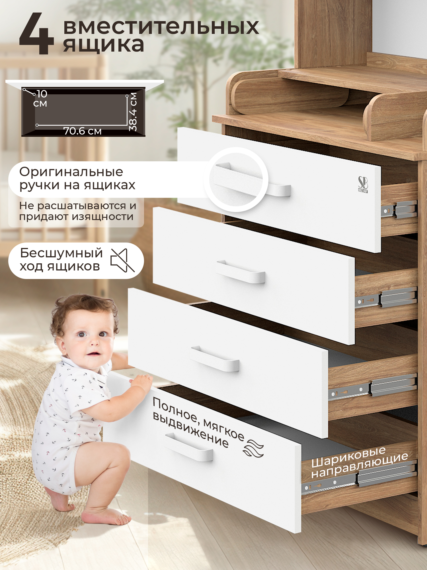 - 4 больших ящика на шариковых направляющих
