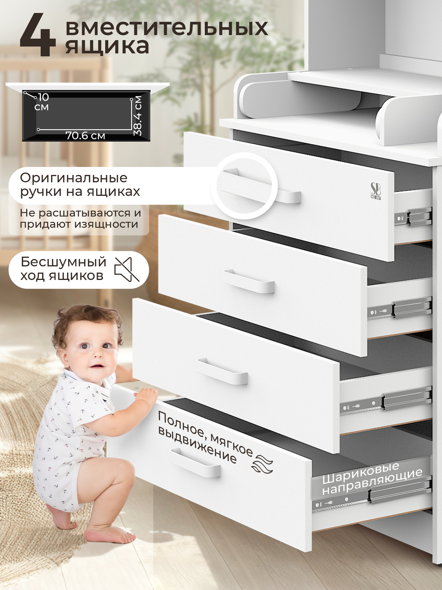 - 4 больших ящика на шариковых направляющих