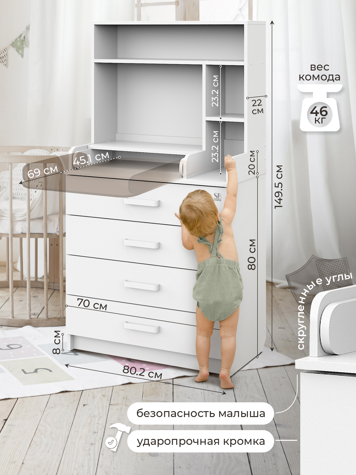 - Высота до пеленального стола 80 см