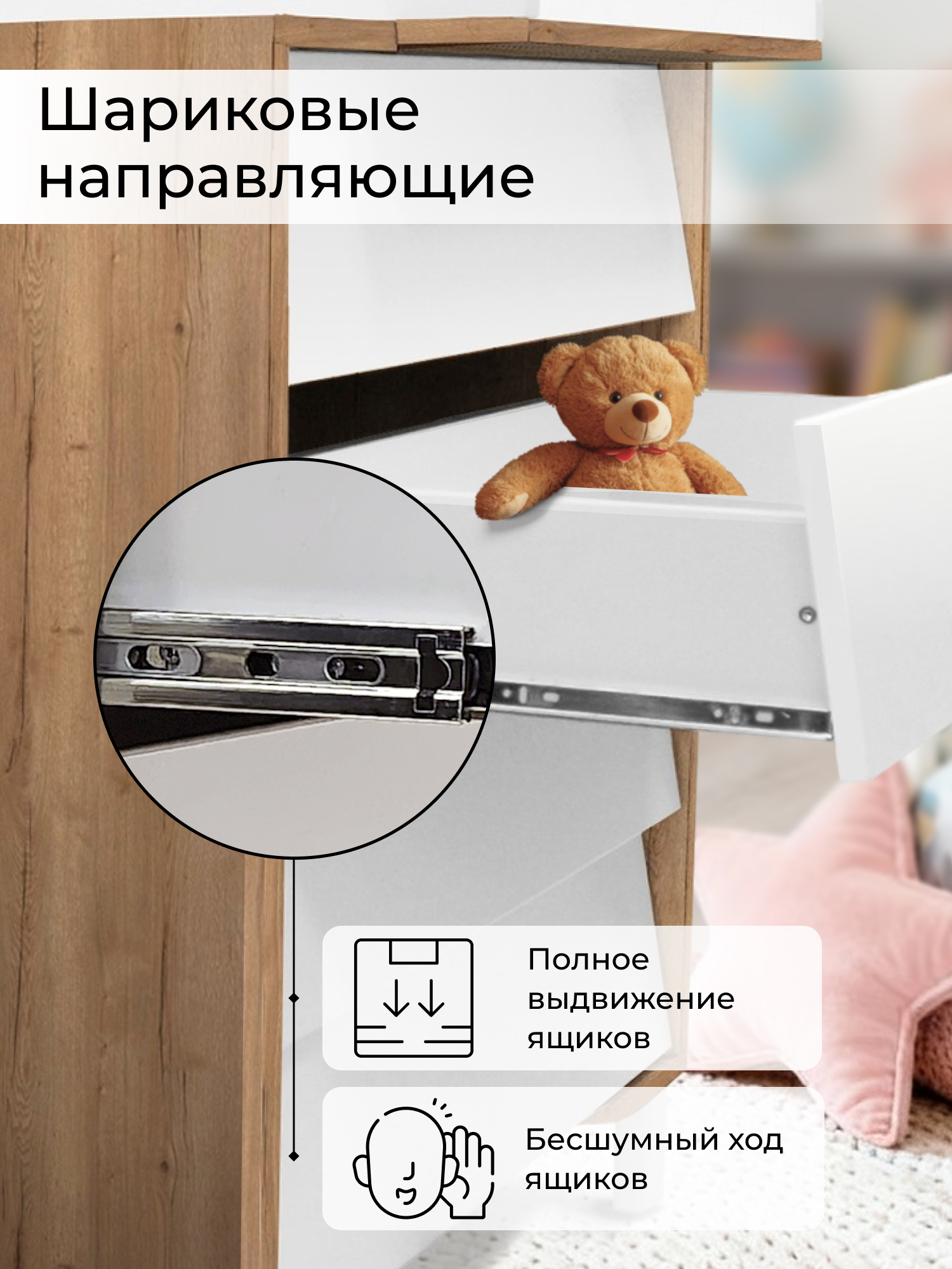 - 4 вместительных ящика на шариковых направвляющих способны выдержать большую нагрузку