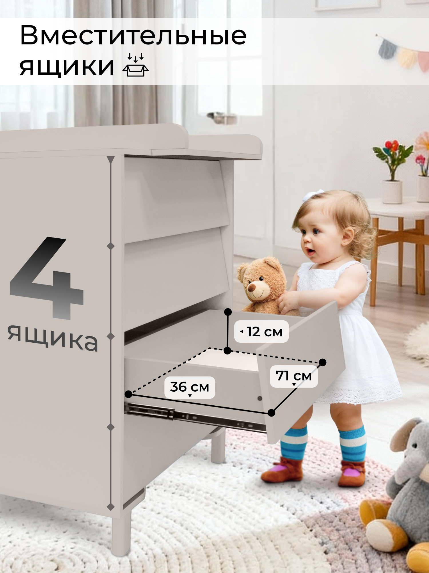 - бортик для пеленания – съемный, благодаря чему вы сможете использовать комод, как классический, когда ваш ребенок подрастет