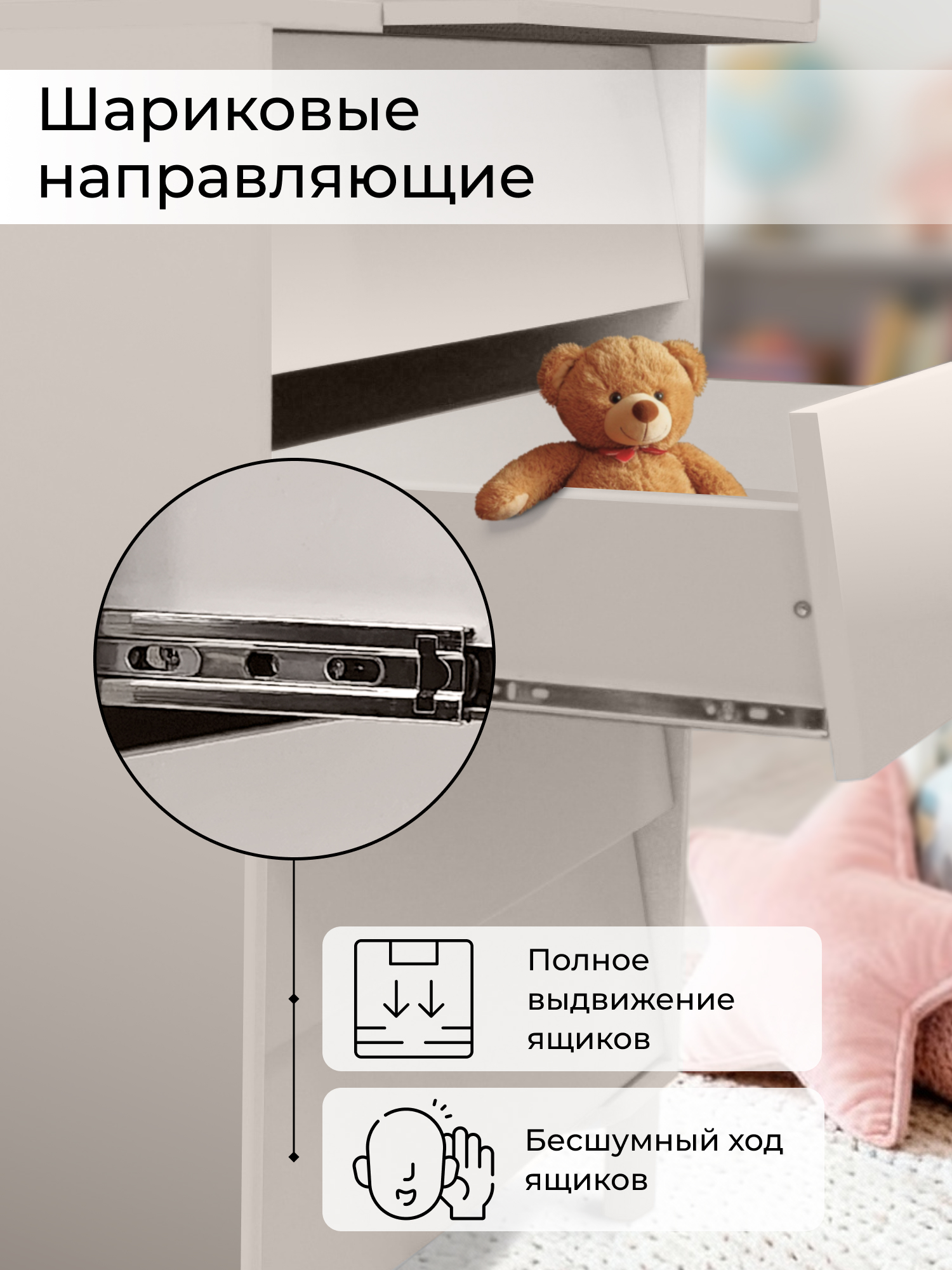 - 4 вместительных ящика на шариковых направвляющих способны выдержать большую нагрузку