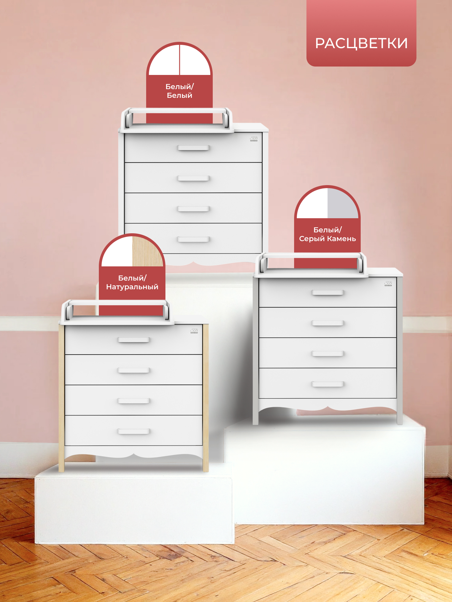 Отличительной особенностью комода является возможность устанавливать раскладной пеленальный столик слева, справа или по центру- как вам удобно!