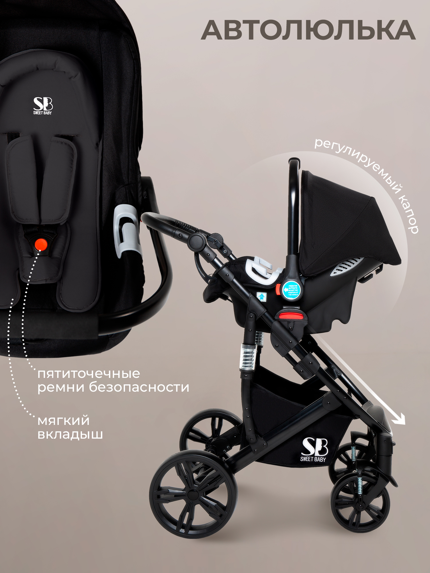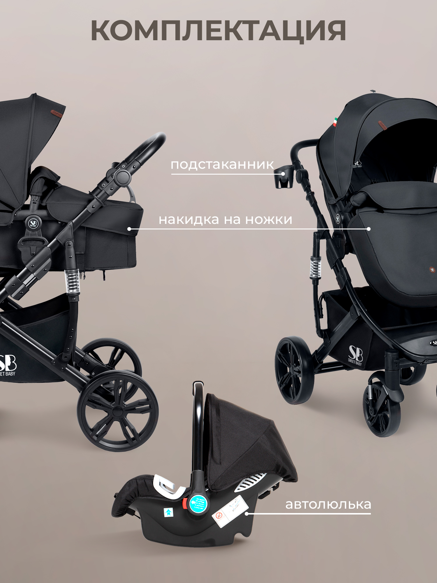 Легкая и уникальная конструкция делает коляску-трансформер Sweet Baby Comfort 3в1 функциональной и комфортной в использовании. Блок-трансформер сочетает и просторную люльку для новорожденных и прогулочный блок для ребенка постарше и автолюльку 0+ для детей от 0 до 15 месяцев. Детская коляска 3в1 Sweet Baby Comfort обладает большим и бесшумным капором, благодаря которому вашему малышу будет уютно и комфортно. Реверсивный прогулочный блок можно ставить как лицом к себе, так и от себя. Регулируемые пятиточечные ремни обеспечат безопасность в движении. Большие задние колеса для высокой проходимости и передние вращающиеся колеса с функцией фиксации для максимальной маневренности. Смотровое окошко на липучке с сеточкой для проветривания. А приятным дополнением станет подстаканник, органайзер для мелких вещей и сетчатый держатель для телефона.