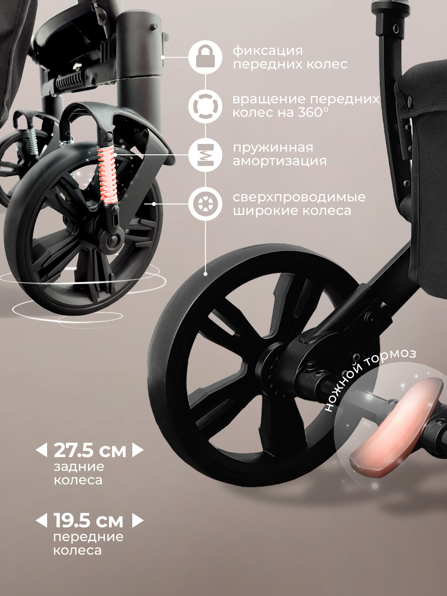 Диаметр колес: передние- 19,5 см, задние- 27,5 см