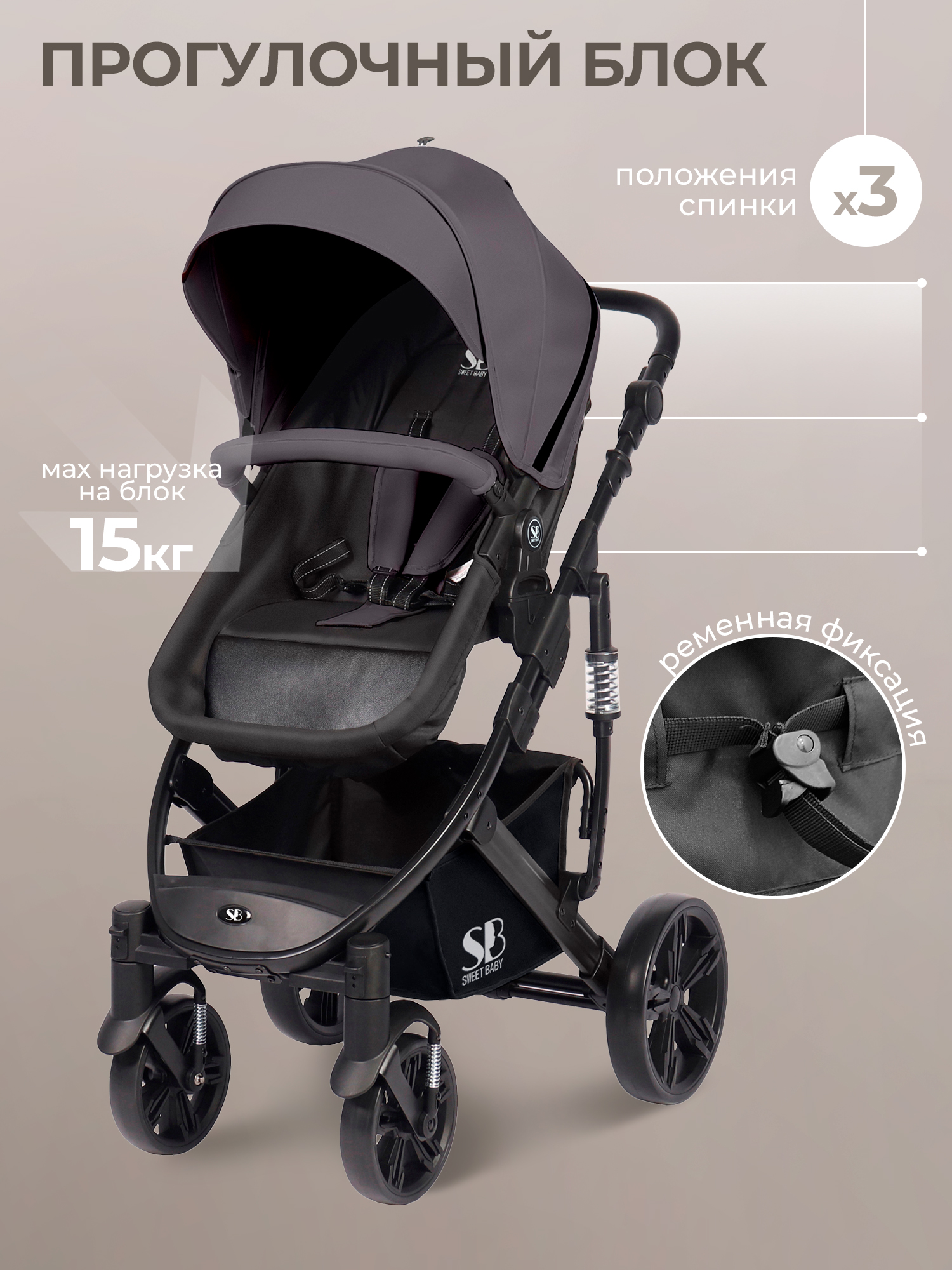 Легкая и уникальная конструкция делает коляску-трансформер Sweet Baby Comfort 3в1 функциональной и комфортной в использовании. Блок-трансформер сочетает и просторную люльку для новорожденных и прогулочный блок для ребенка постарше и автолюльку 0+ для детей от 0 до 15 месяцев. Детская коляска 3в1 Sweet Baby Comfort обладает большим и бесшумным капором, благодаря которому вашему малышу будет уютно и комфортно. Реверсивный прогулочный блок можно ставить как лицом к себе, так и от себя. Регулируемые пятиточечные ремни обеспечат безопасность в движении. Большие задние колеса для высокой проходимости и передние вращающиеся колеса с функцией фиксации для максимальной маневренности. Смотровое окошко на липучке с сеточкой для проветривания. А приятным дополнением станет подстаканник, органайзер для мелких вещей и сетчатый держатель для телефона.