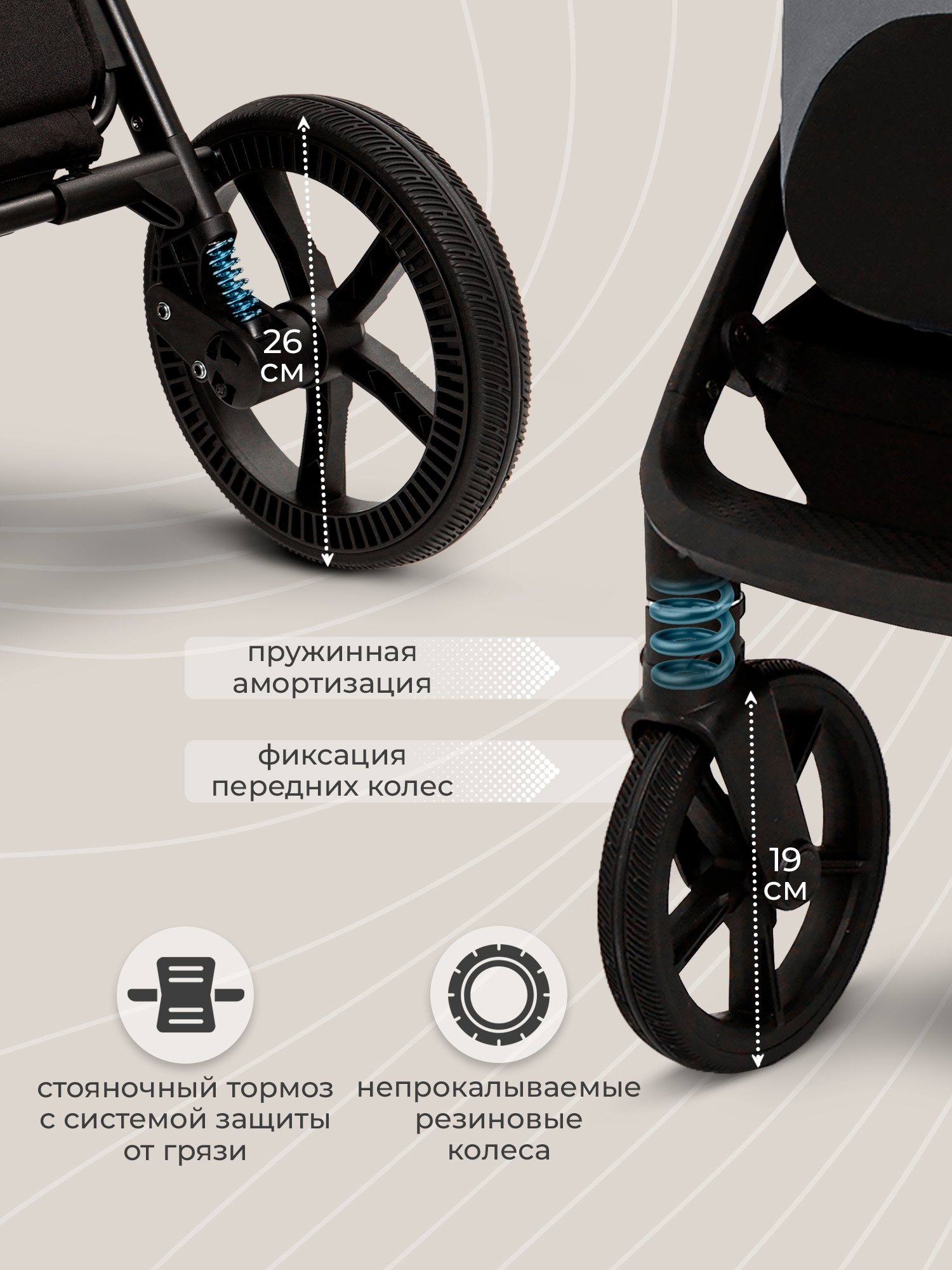 - Большие непрокалываемые колеса с мягкой амортизацией легко справятся с бездорожьем, включая снежные сугробы, грязь и бордюры.