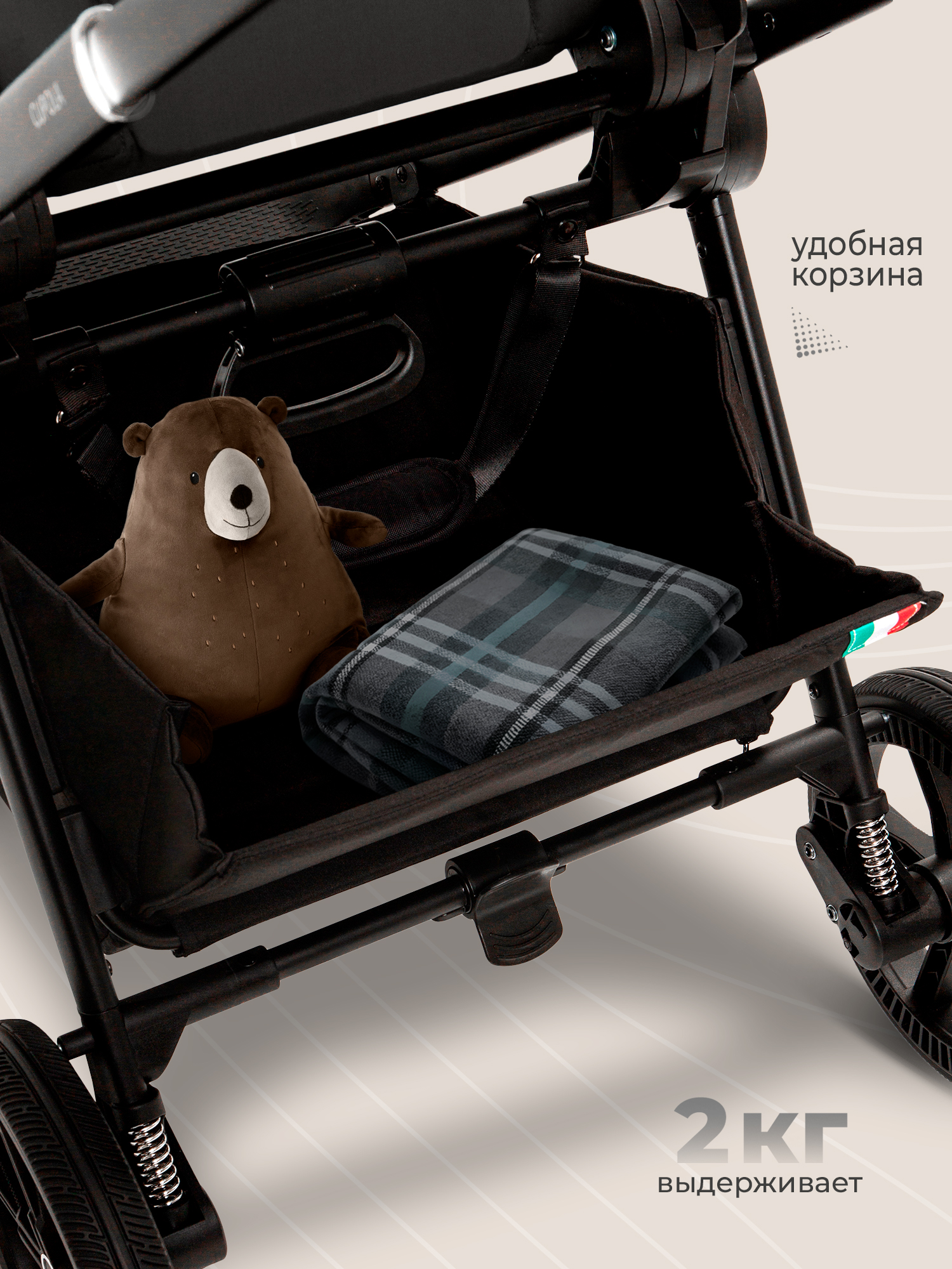 - Вместительная корзина с усиленным дном — настоящий помощник для родителей, идеальная для покупок или личных вещей.