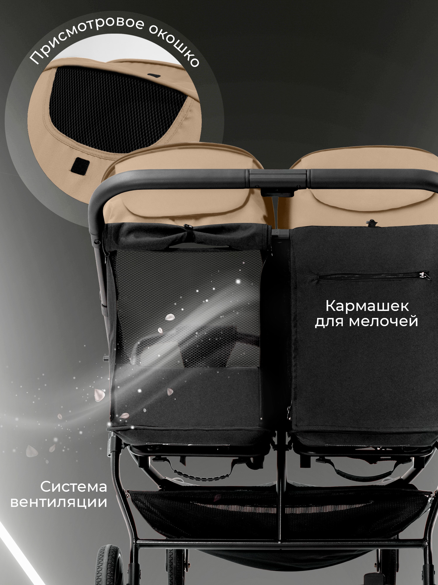 - Рама коляски оснащена двумя сиденьями с индивидуальными системами регулировки, что обеспечивает максимальный комфорт во время поездок с двумя малышами.