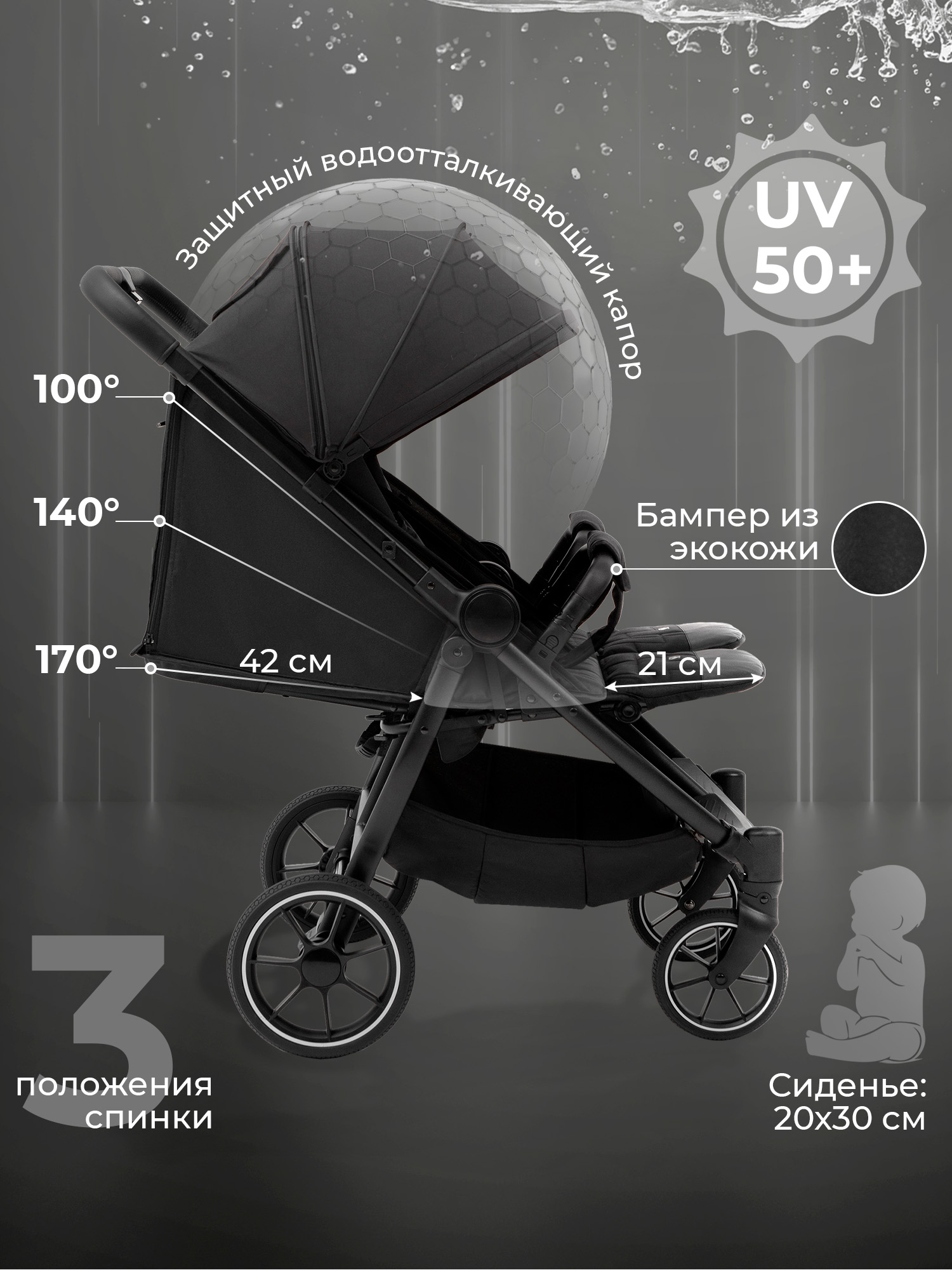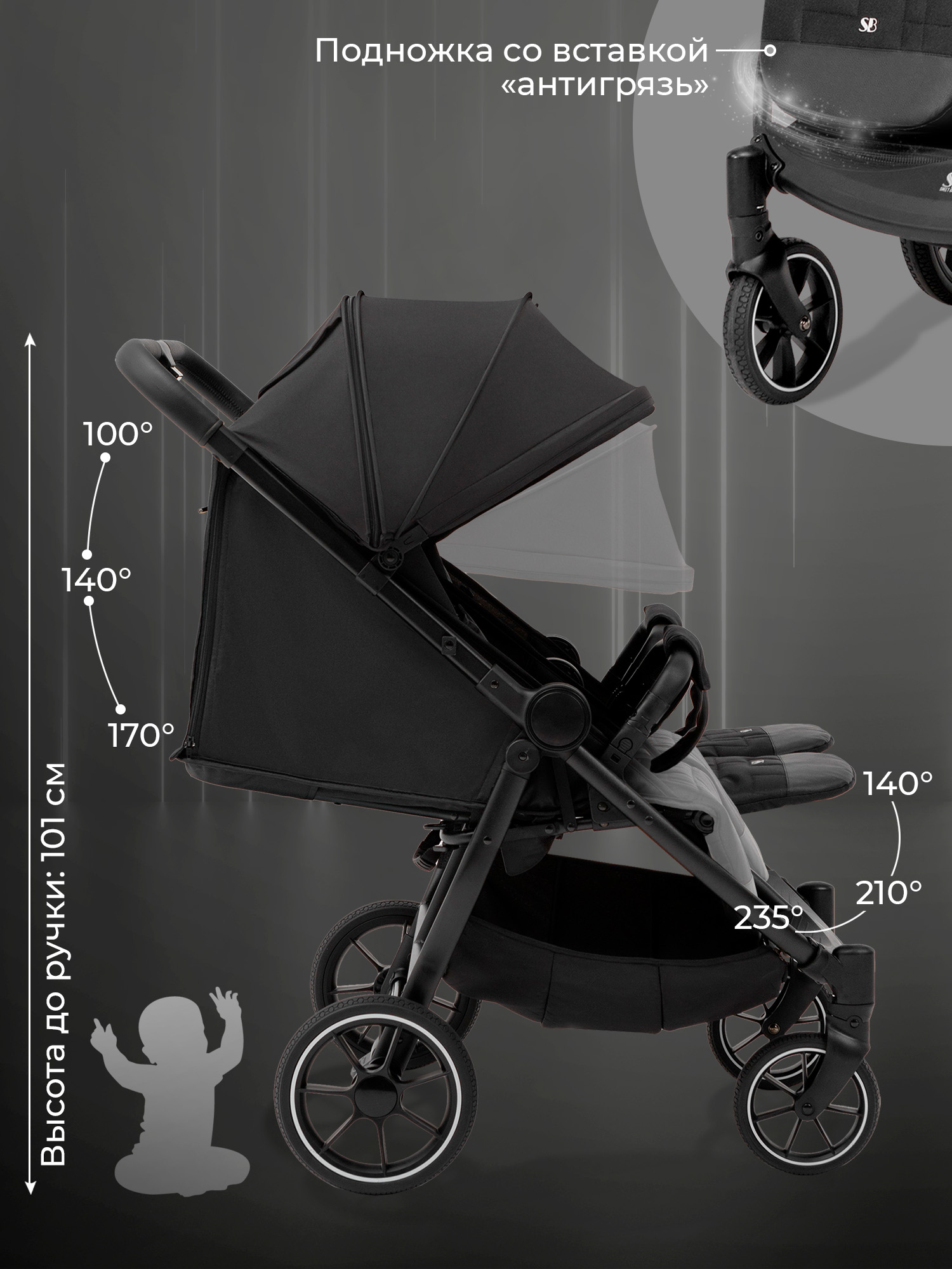 - Утепленные накидки для ножек и глубокий капюшон гарантируют комфортные прогулки при любой погоде.