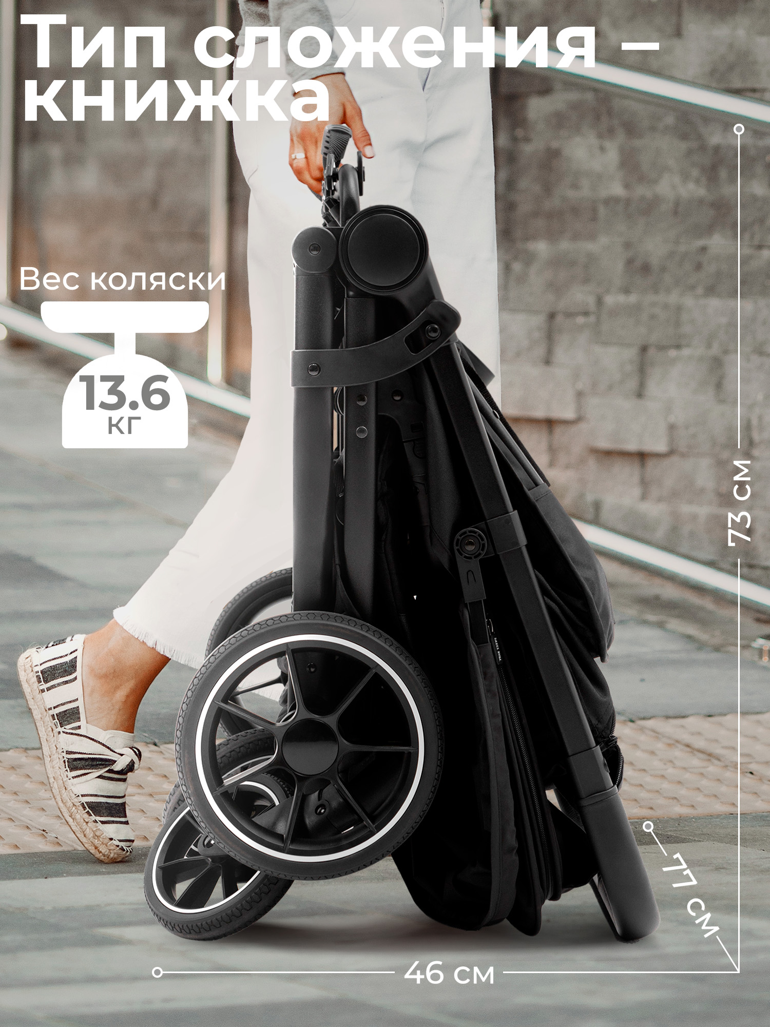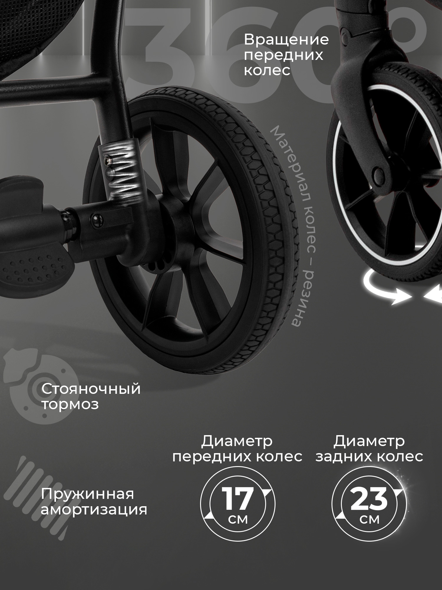 - Большие колеса из резины обеспечивают легкость преодоления любых дорожных неровностей.