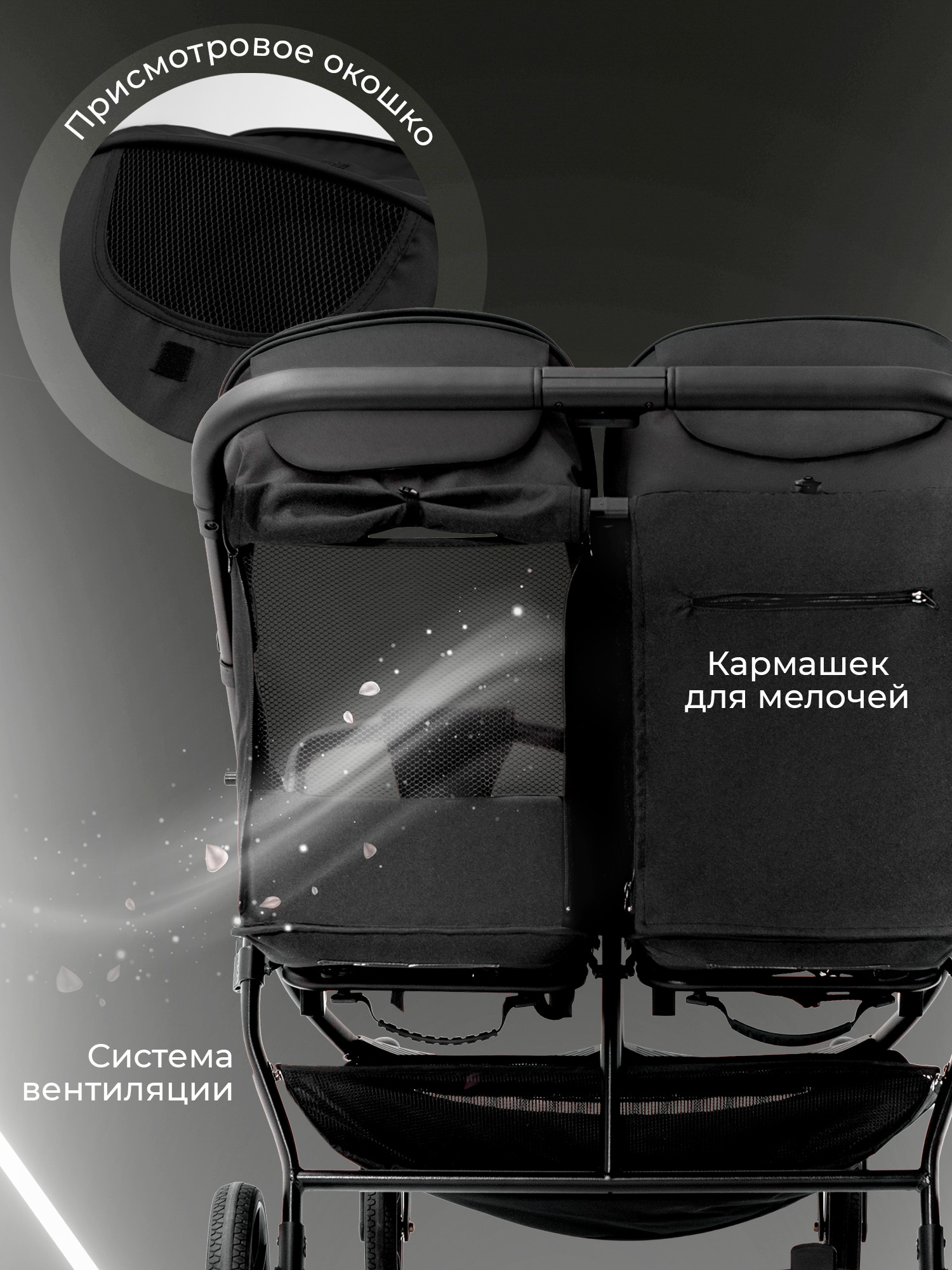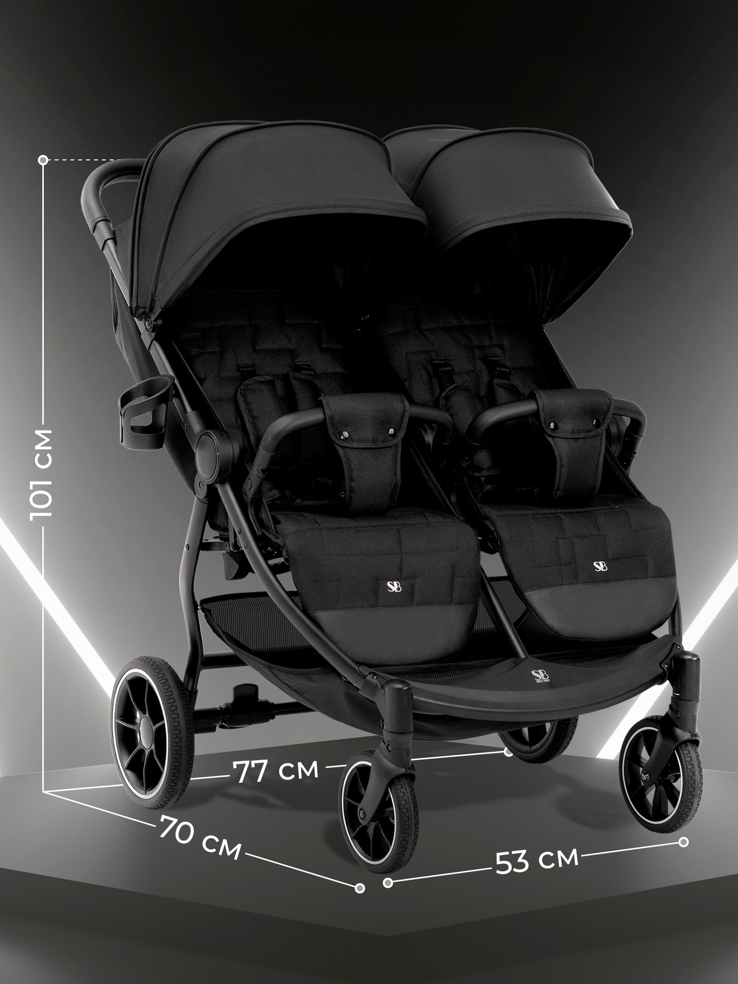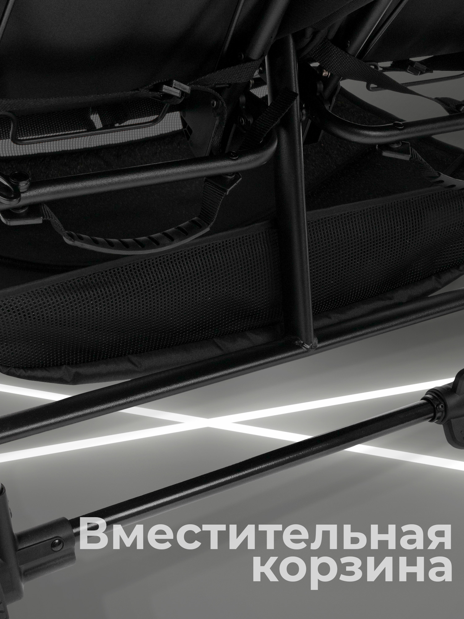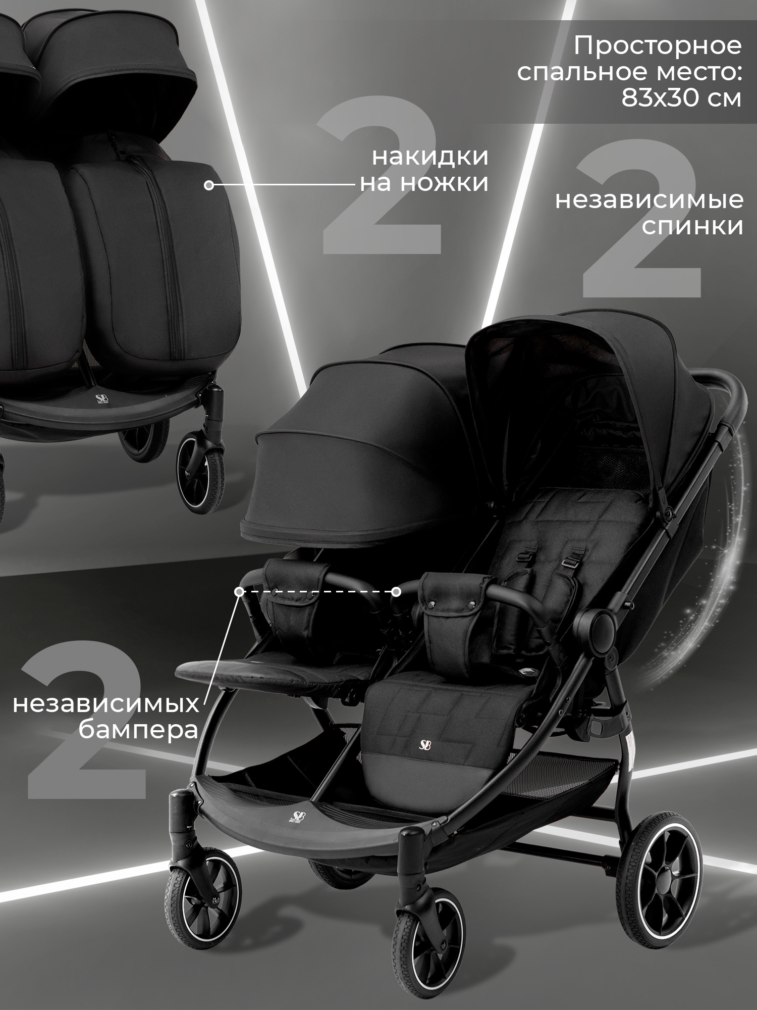 - Рама коляски оснащена двумя сиденьями с индивидуальными системами регулировки, что обеспечивает максимальный комфорт во время поездок с двумя малышами.