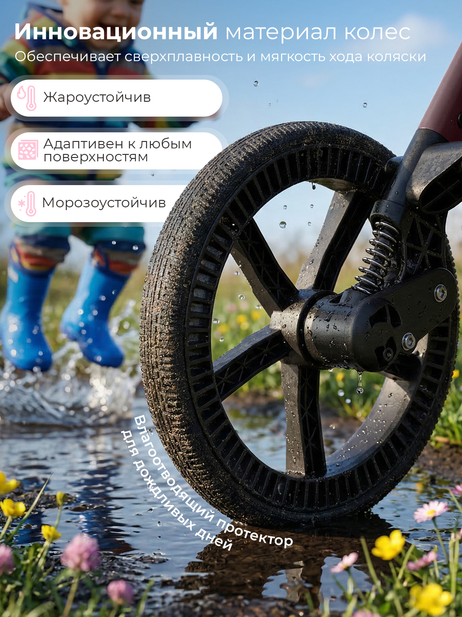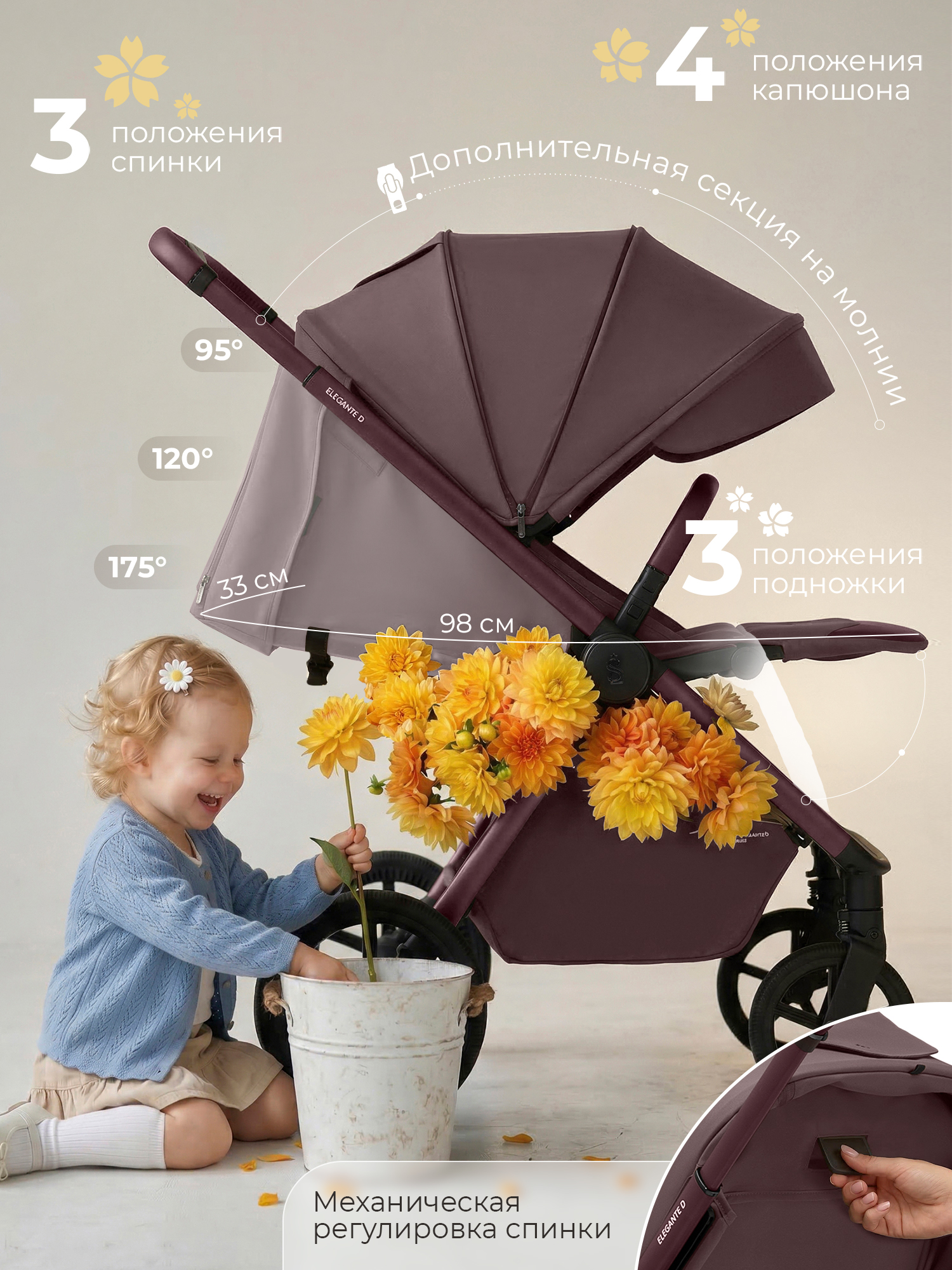 - Водоотталкивающая ткань капора защищает от ультрафиолетовых лучей и непогоды, а накидка на ножки - распашонка с легким доступом к ребенку – от ветра и холода;