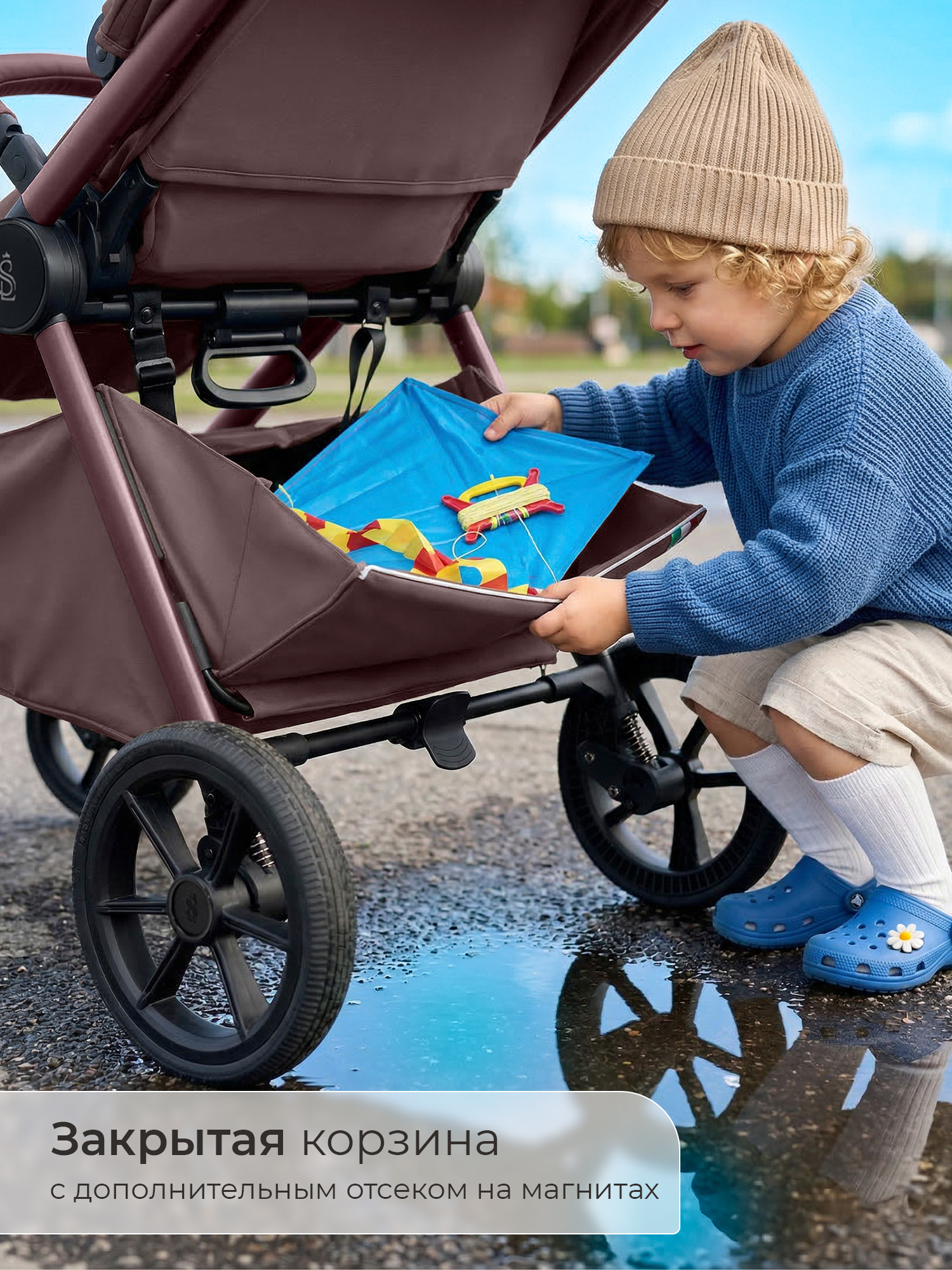 - Коляска складывается одним движением тканью вовнутрь;