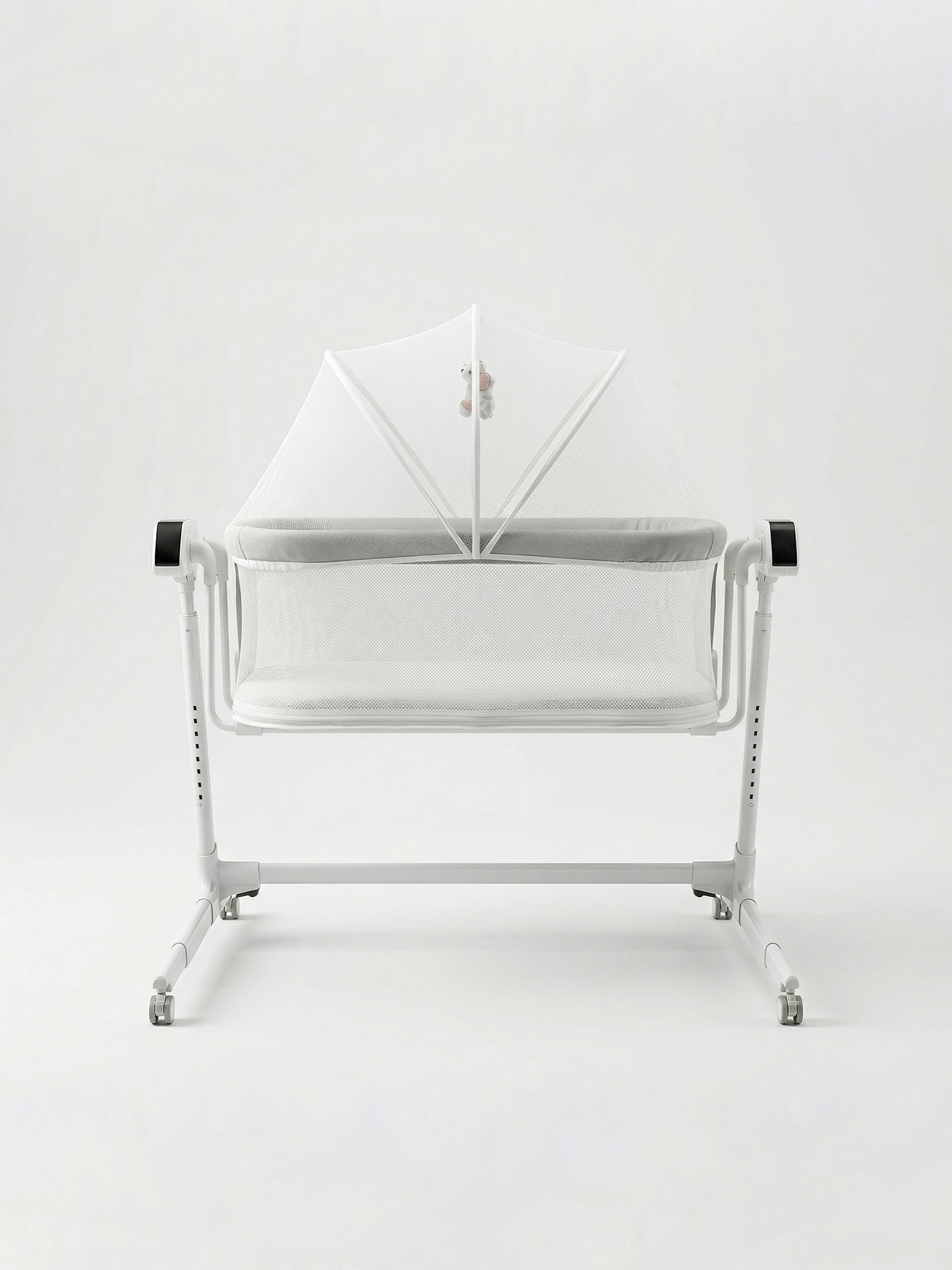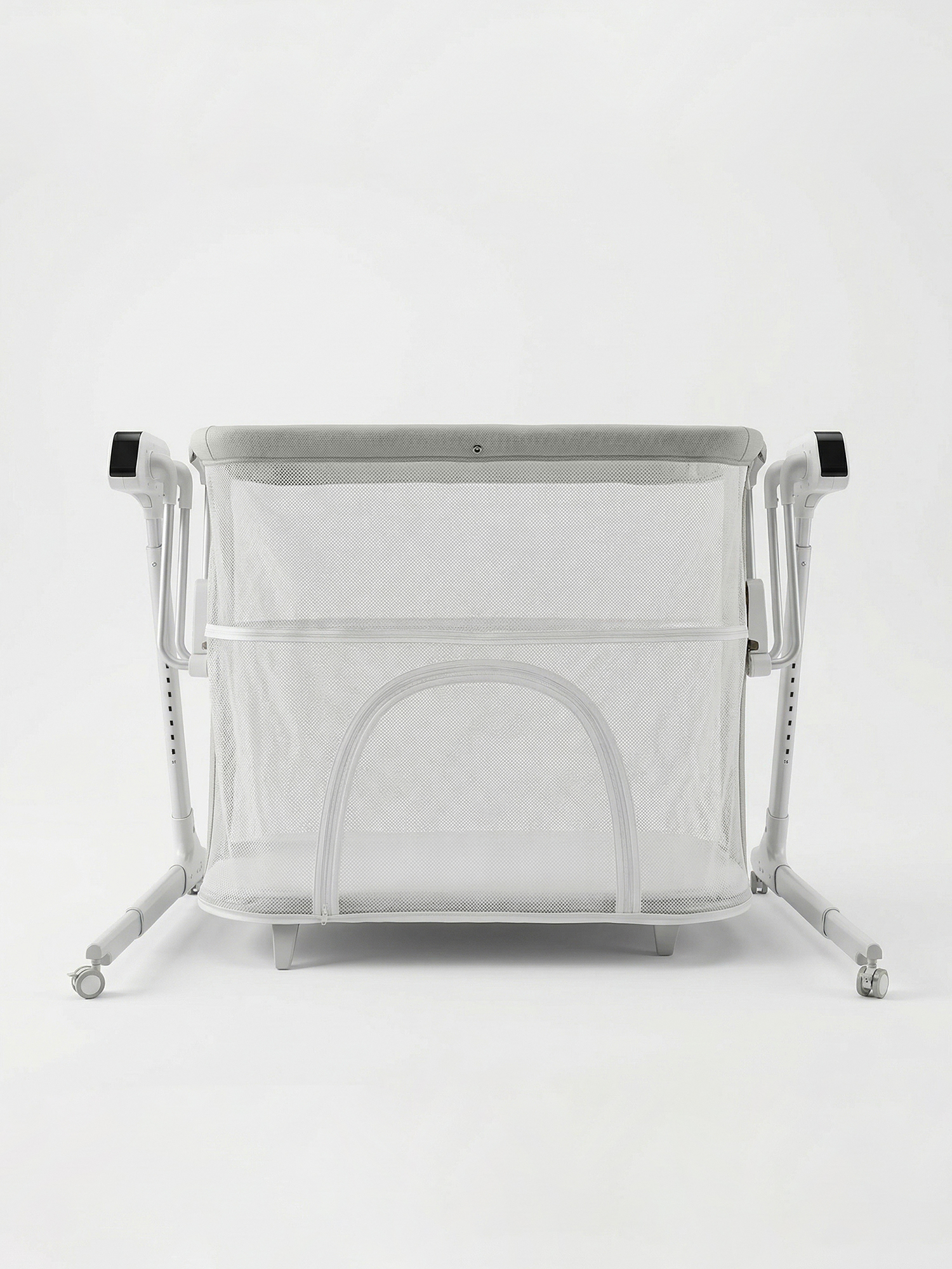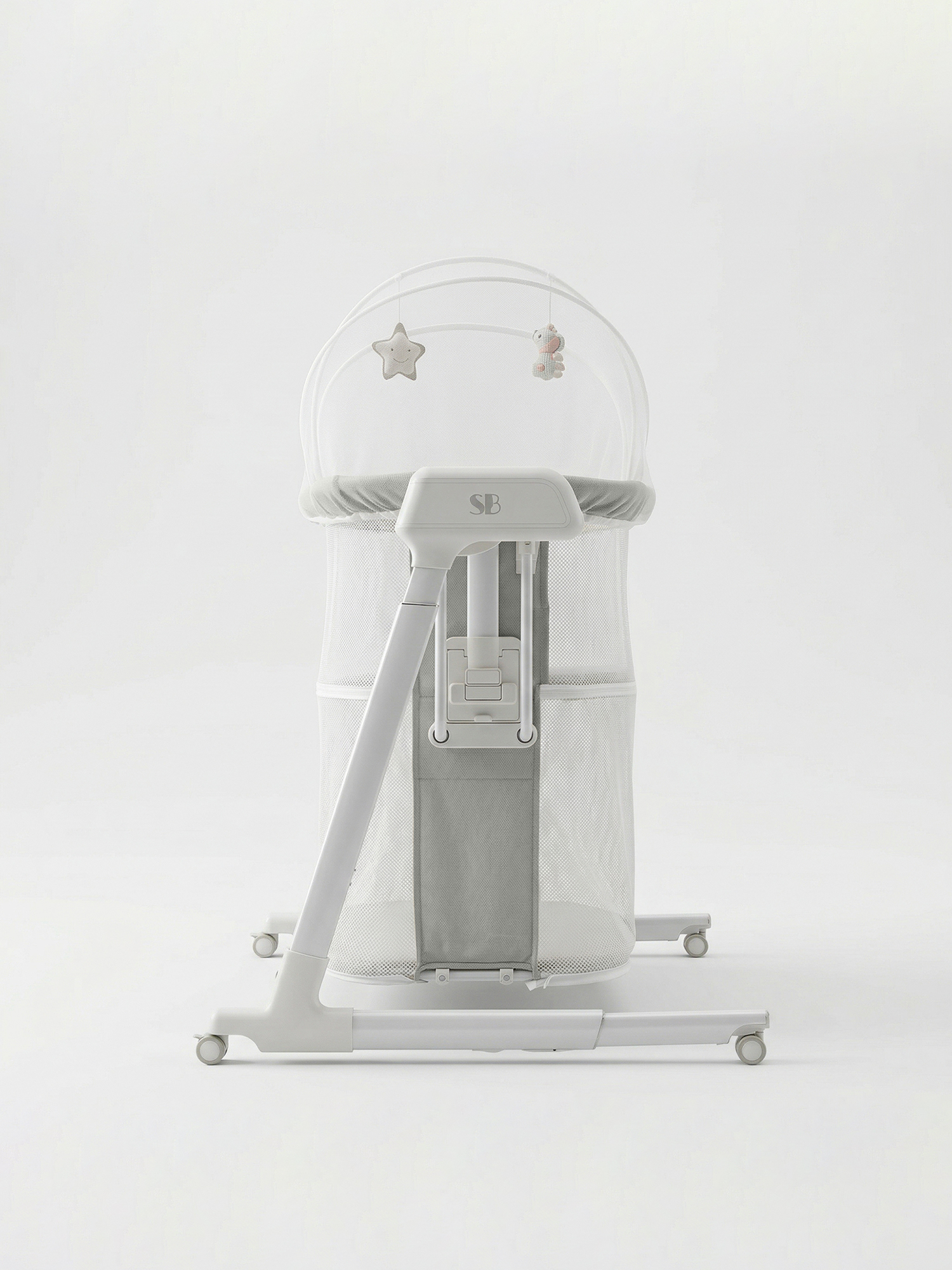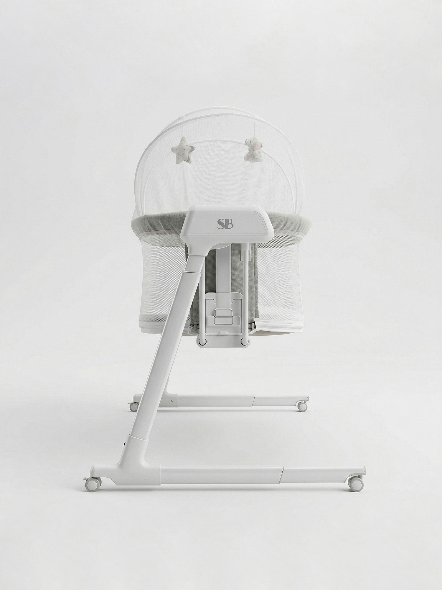 - 8 положений регулировки высоты позволяют настроить колыбель под родителей любого роста, а также превратить ее в приставную кроватку, подобрав идеальное расположение рядом с родительской кроватью.