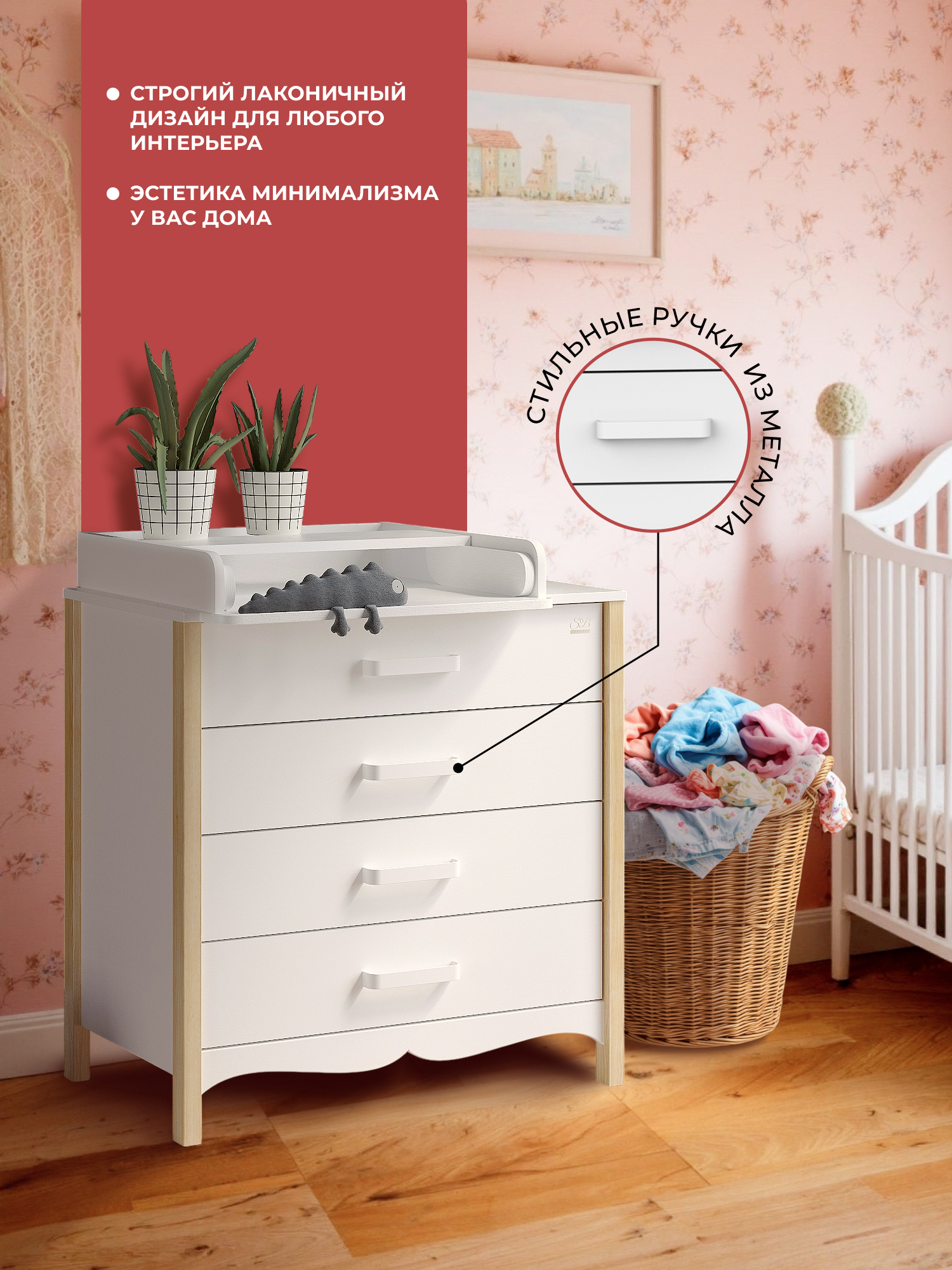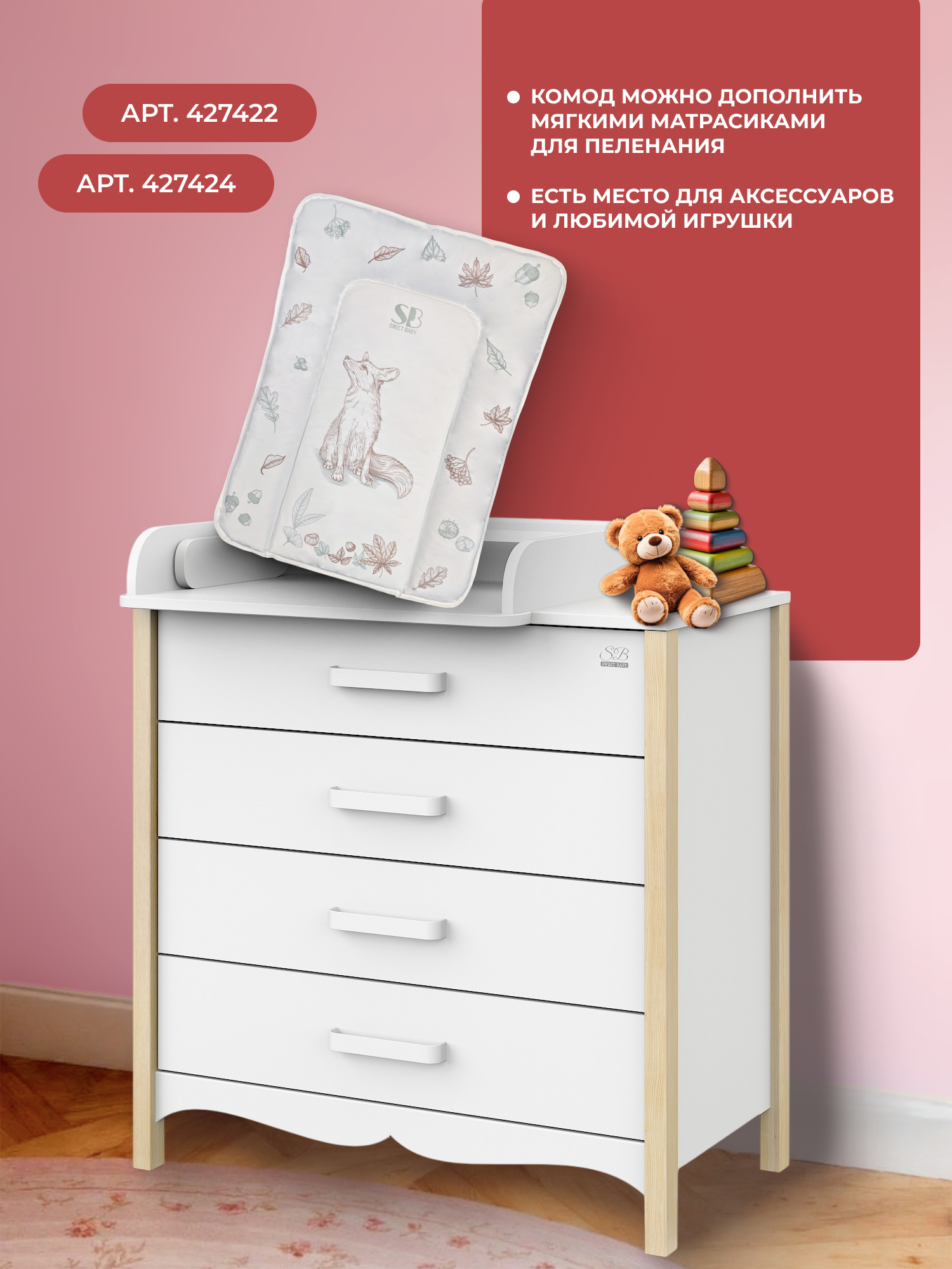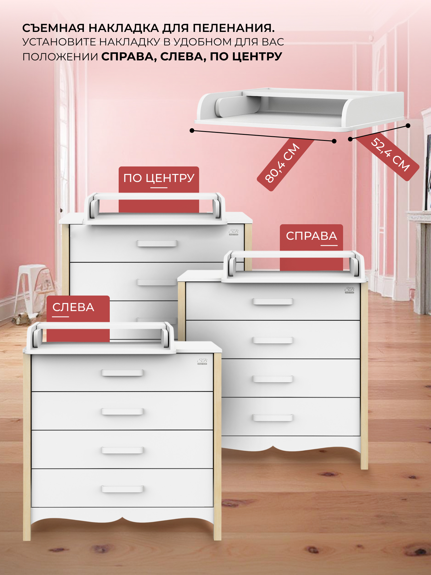 Отличительной особенностью комода является возможность устанавливать раскладной пеленальный столик слева, справа или по центру- как вам удобно!