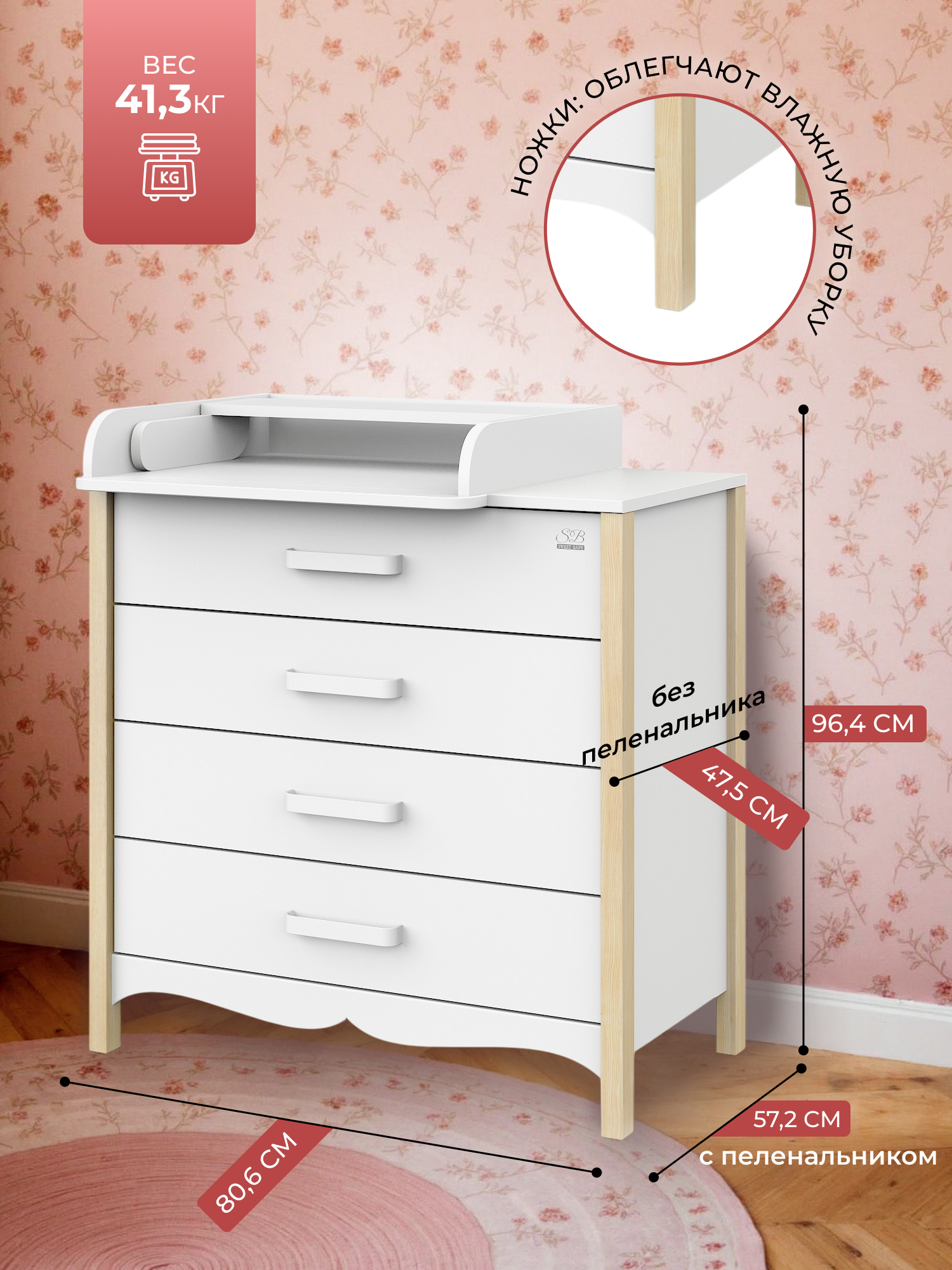 Пеленальный комод обладает стильными и устойчивыми ножками, выполненными из дерева.