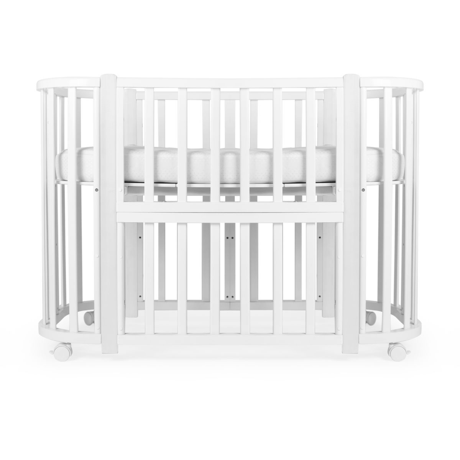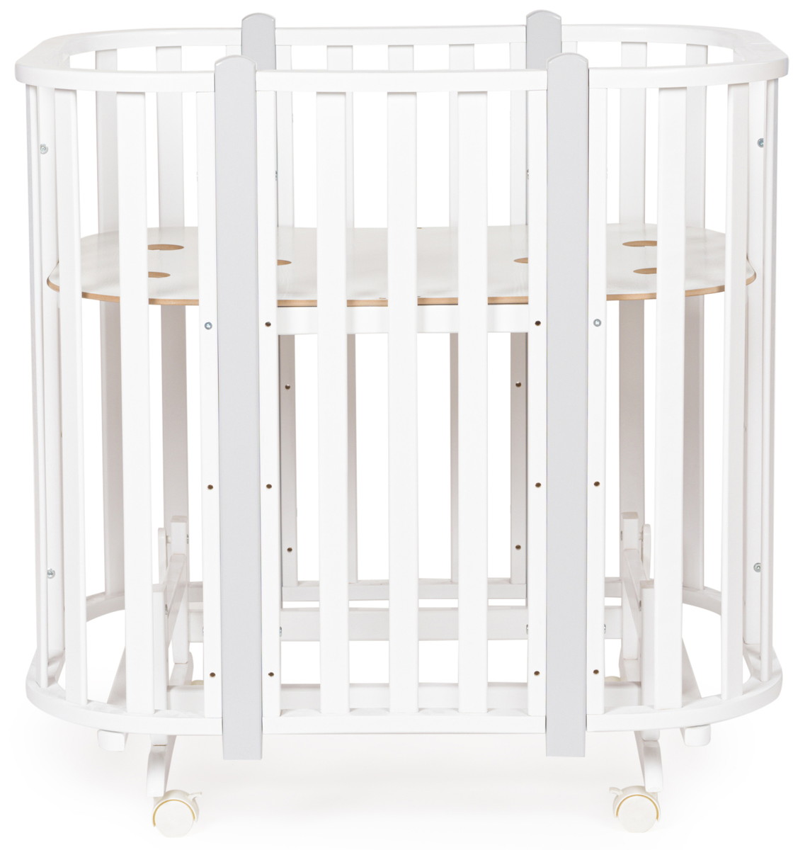Съемная передняя стенка дает возможность трансформировать колыбель в приставную, а кроватку - в диванчик для подросших малышей.