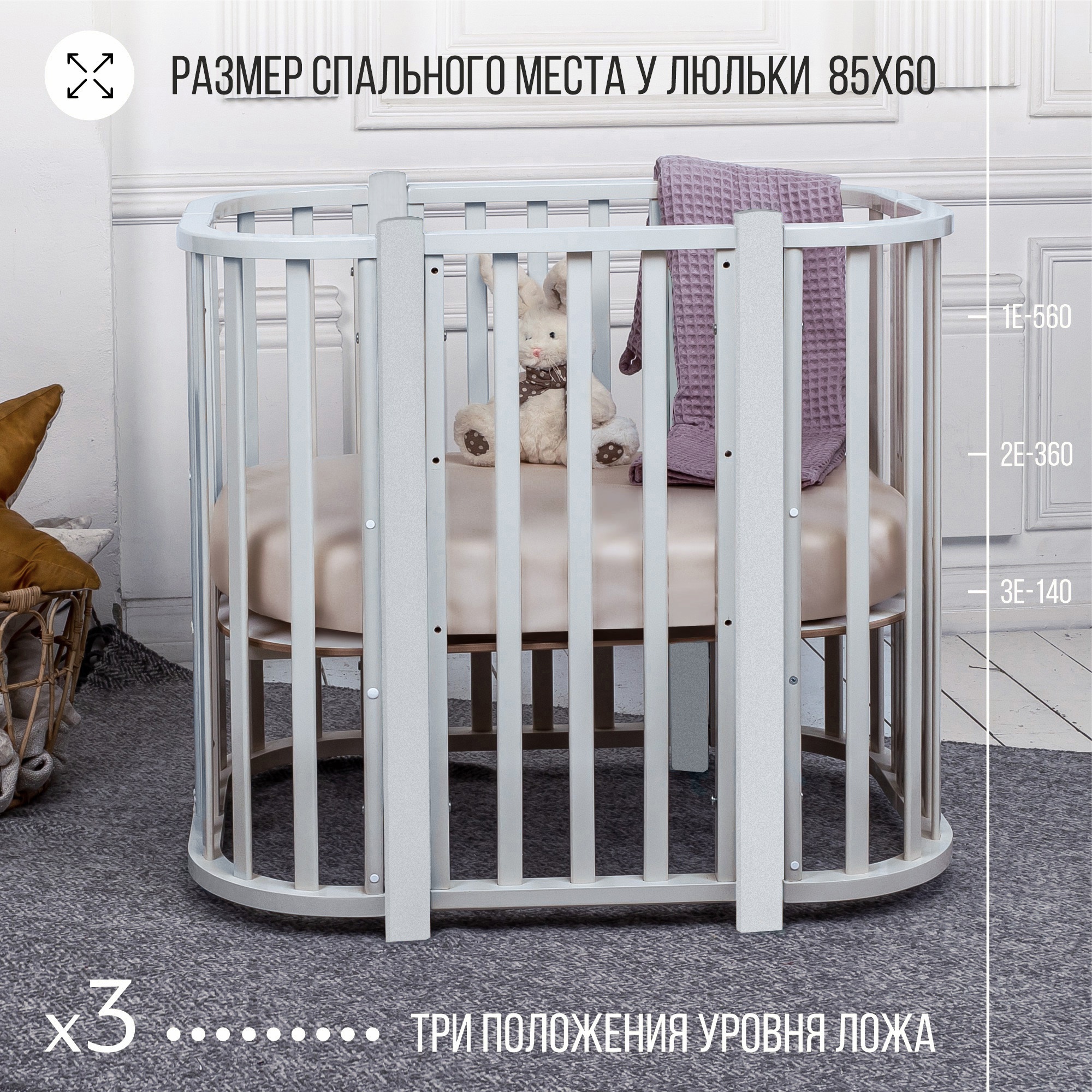В зависимости от роста и возраста ребенка уровень дна кроватки регулируется в 3 положениях, что обеспечивает безопасность малыша и удобный доступ к нему.