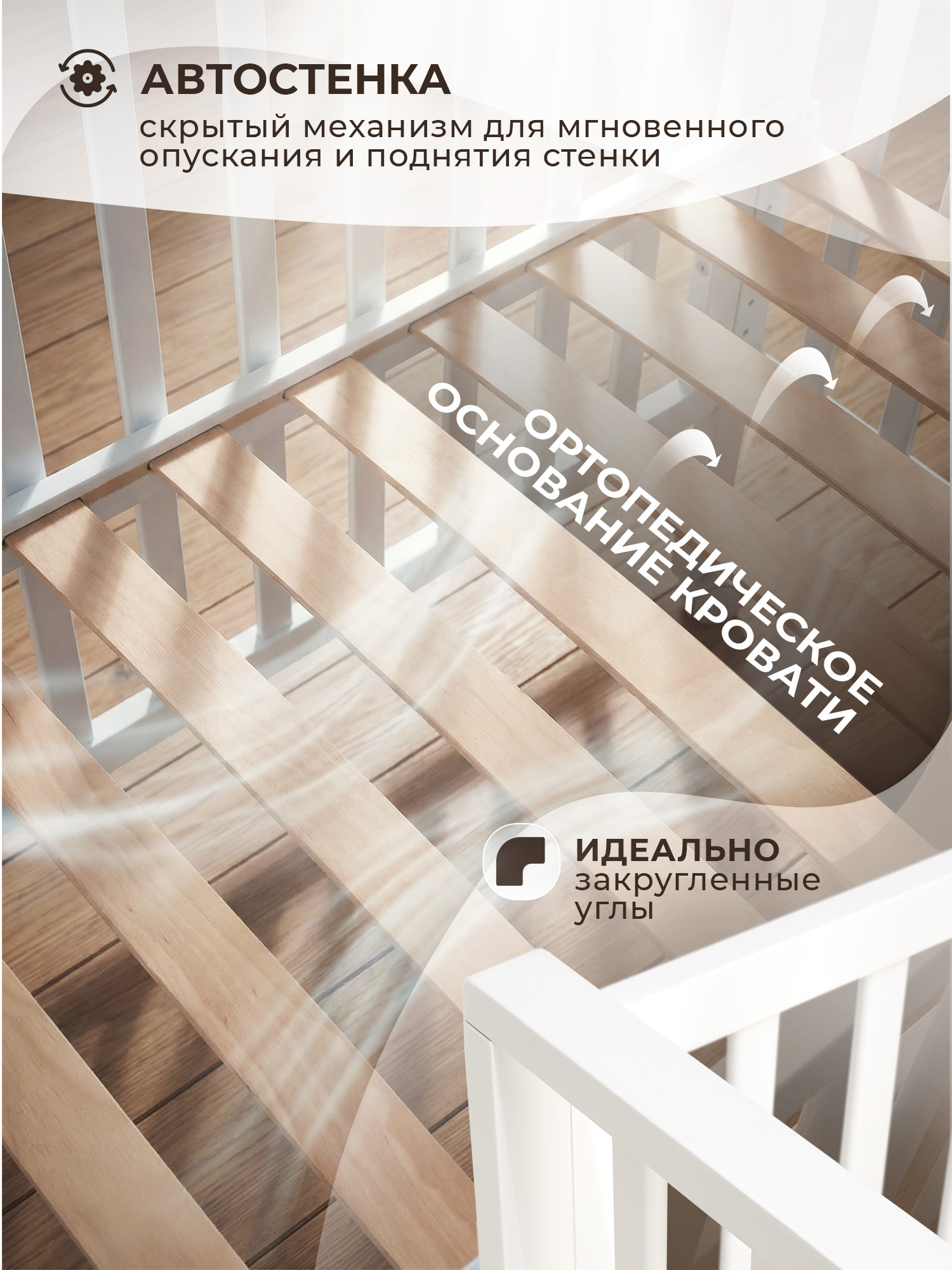 - Лаконичные формы и нейтральные оттенки кроватки гармонично сочетаются с любым интерьером детской комнаты;