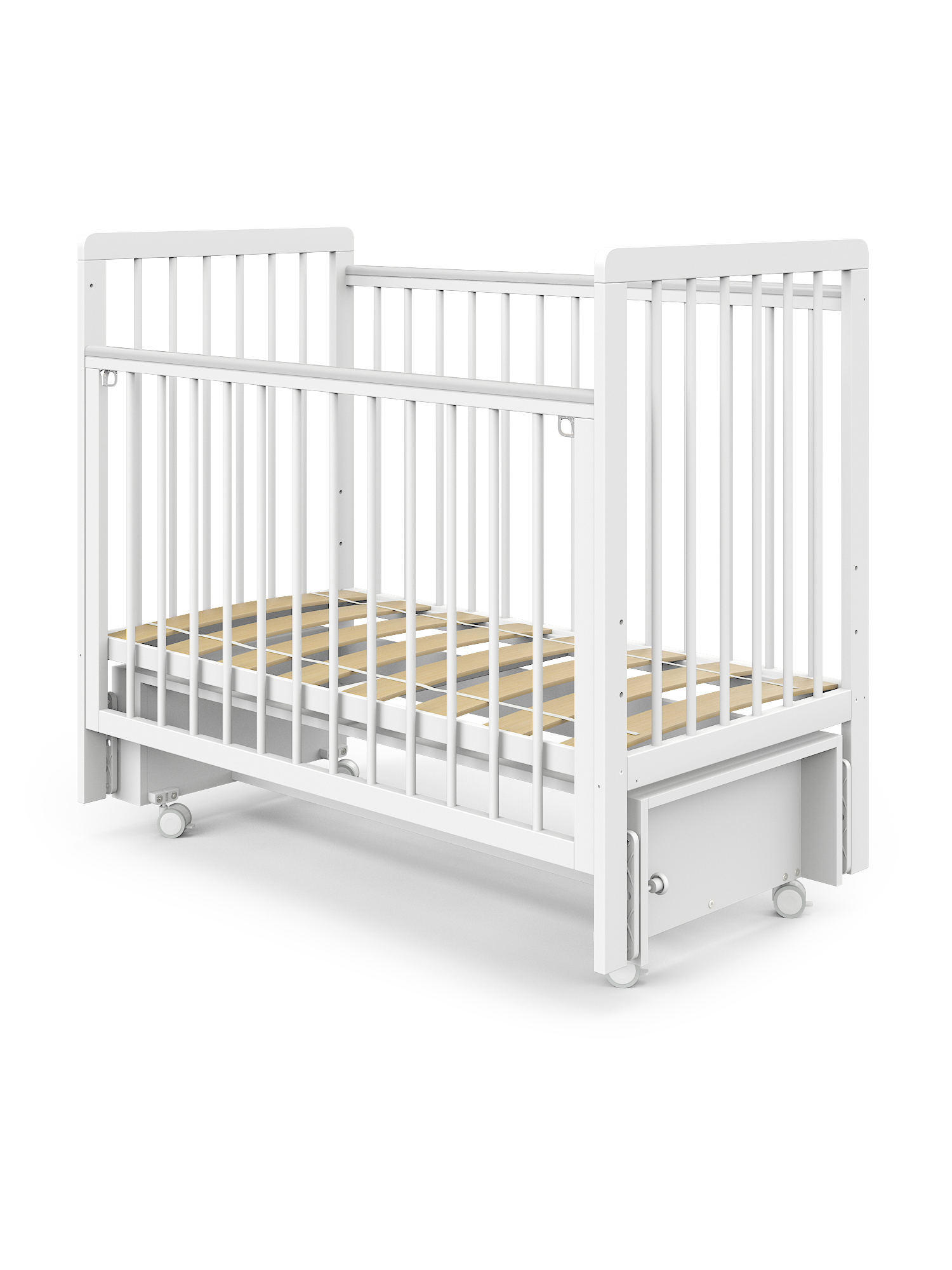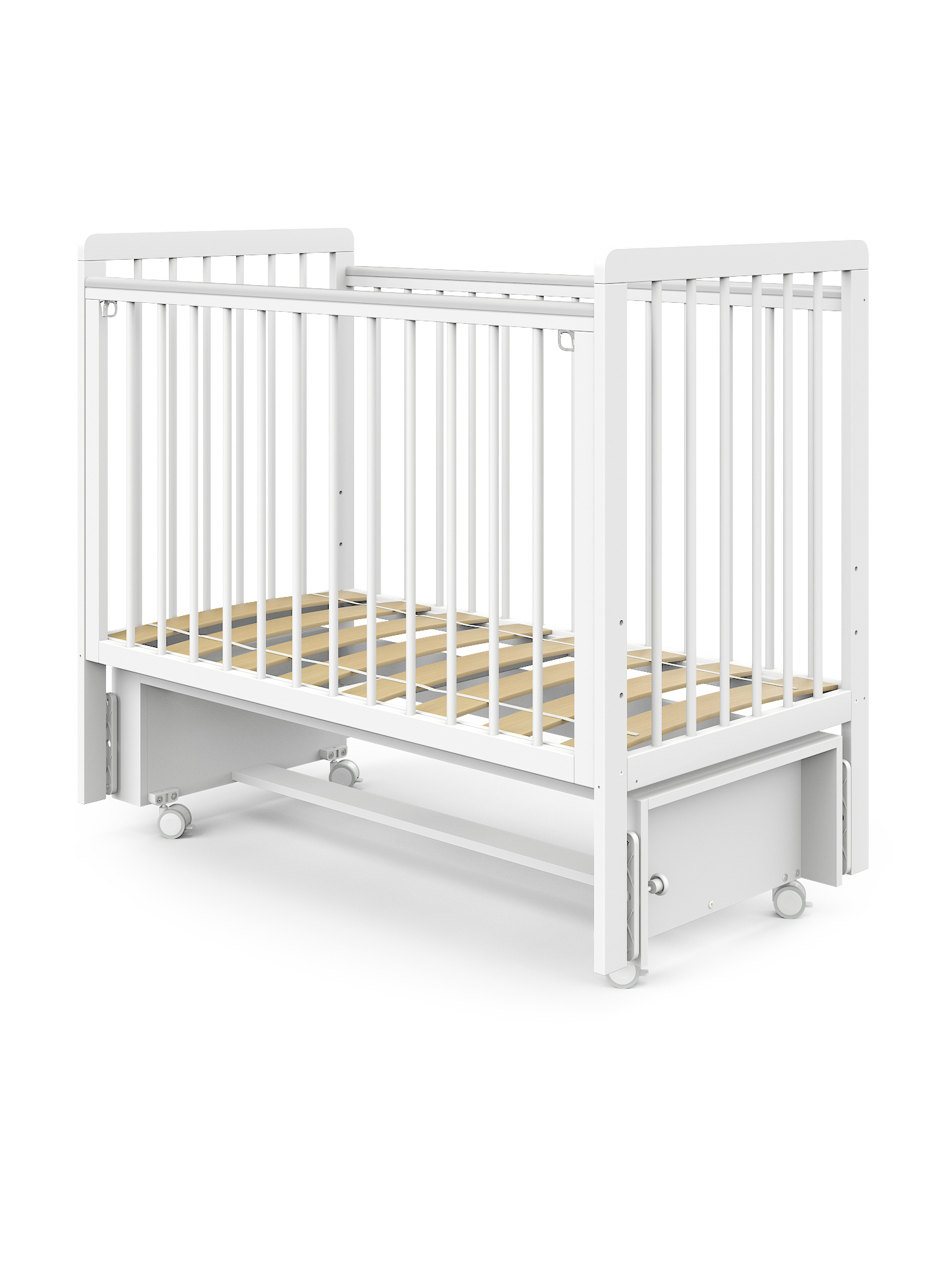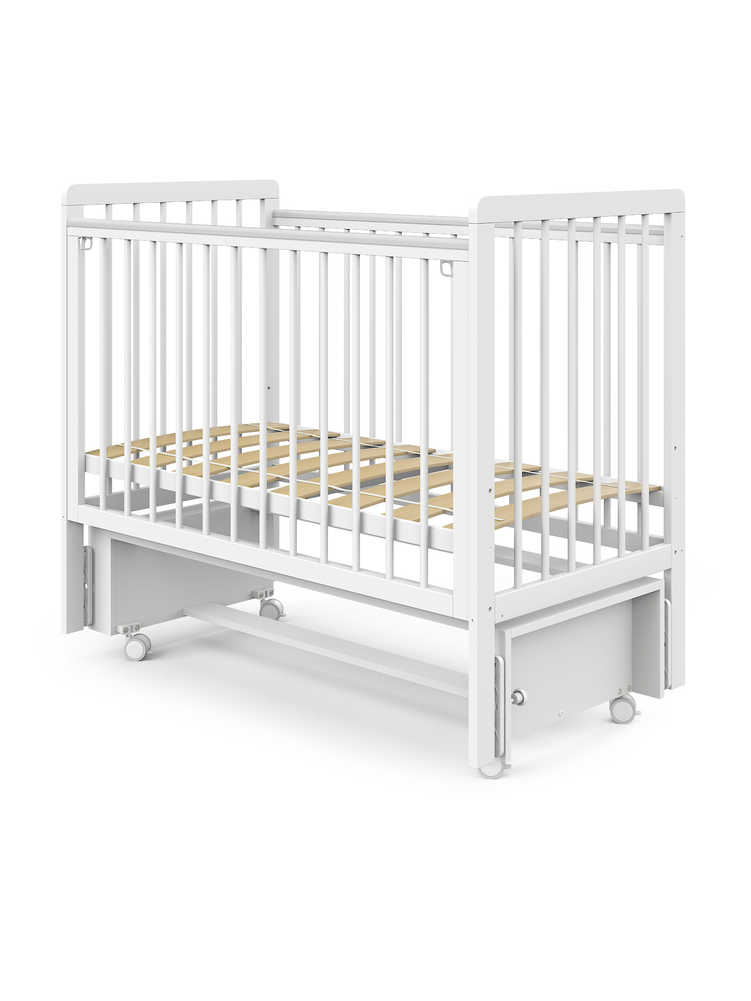 Оснащенная прорезиненными колесами, кроватка легко перемещается по квартире, не царапая пол и обеспечивая мягкость хода.